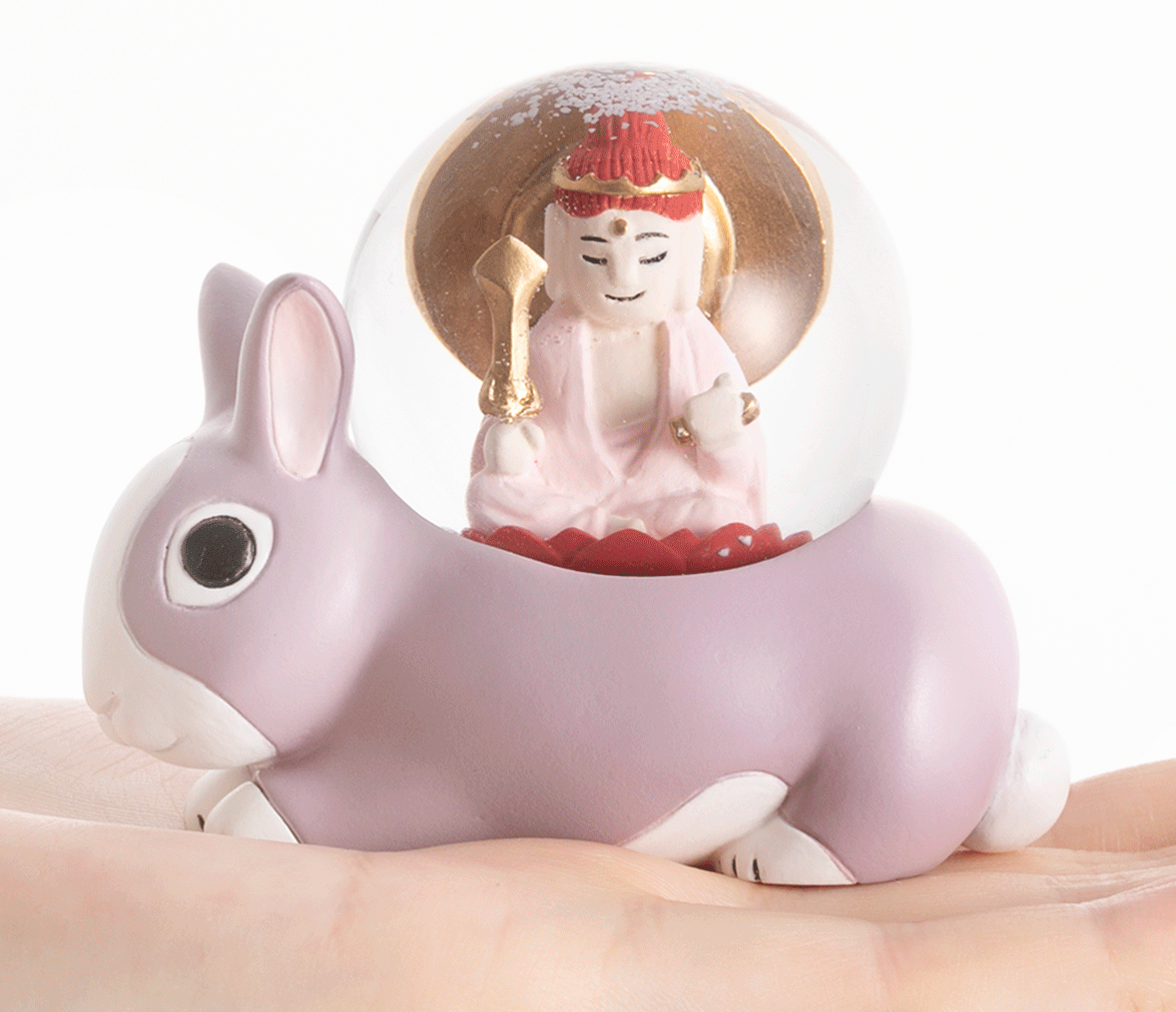 スノードームシリーズに、2023年の干支と仏さまをテーマにした新作が登場です。 仏教における「守り本尊」の考えから兎を台座のモチーフにしています。ぴょんと跳ねて運気を上げ、長い耳で福を集める、縁起のよい動物と言われています。そんな兎にしっかりと支えられたドームの中には、やさしいお顔の文殊菩薩さまが。宝冠の形や衣の衣紋(ドレープ)など、細かなディティールまで再現しています。ちょこんとかわいい手のひらサイズで、振るとキラキラと癒しのひとときをもたらしてくれます。