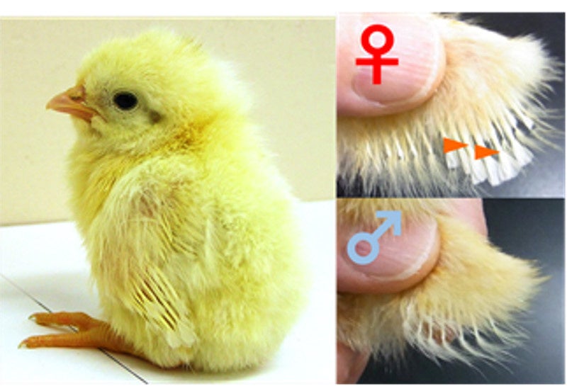 伴性遺伝する遅羽遺伝子を利用し、オス(♂)の主翼羽の伸長をメス(♀)より遅らせることで、雌雄鑑別を容易にする「羽毛鑑別法」が広く用いられています。図中の赤色の矢印はメスの主翼羽を示しており、オスの翼では主翼羽が発達していないことが確認できます。