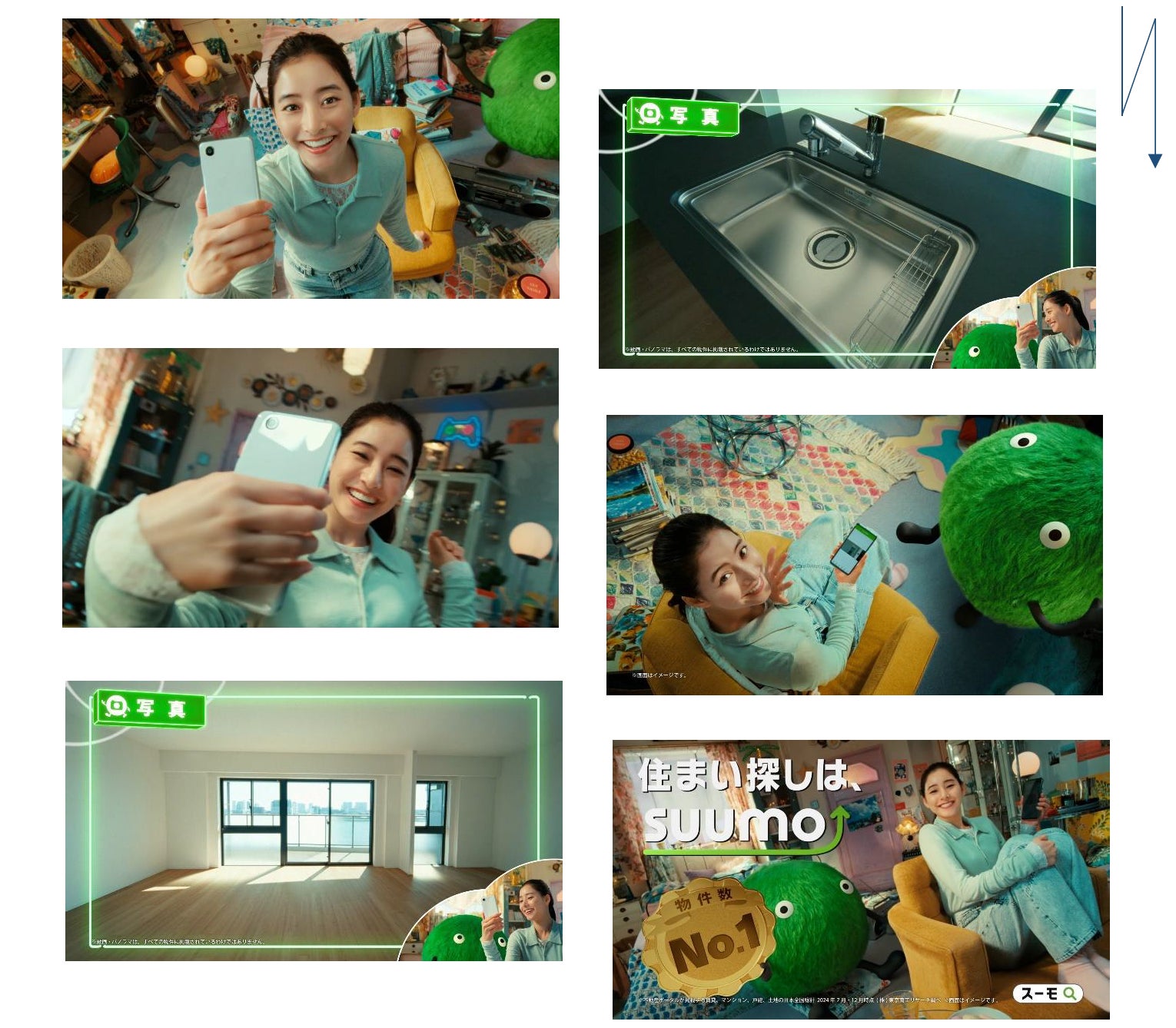 今回のCMは、ピンクや紫、黄色などカラフルでレトロなアメリカンスタイルの部屋の中で、新木さんが『SUUMO』を使って住まい探しを楽しんでいるストーリーです。新木さんがスマホを手に「SUUMO、スマホで内見!? 行ってみよー!」と声を弾ませると、スマホ画面に映し出された物件写真の中へ吸い込まれるようにズームイン。リビングやキッチン、廊下など、スマホ画面を通して部屋の隅々を自由にチェックしながら、新木さんは「写真がいっぱい! 動画も、パノラマもあるんだ」と横にいるスーモにスマホを見せながら、テンションもアップ。そして最後は、ズームアウトするカメラに視線を送ると、「気になるお部屋、見に行った気分♪」とニッコリ。スマホでの住まい探しを楽しんだ様子を表現しました。