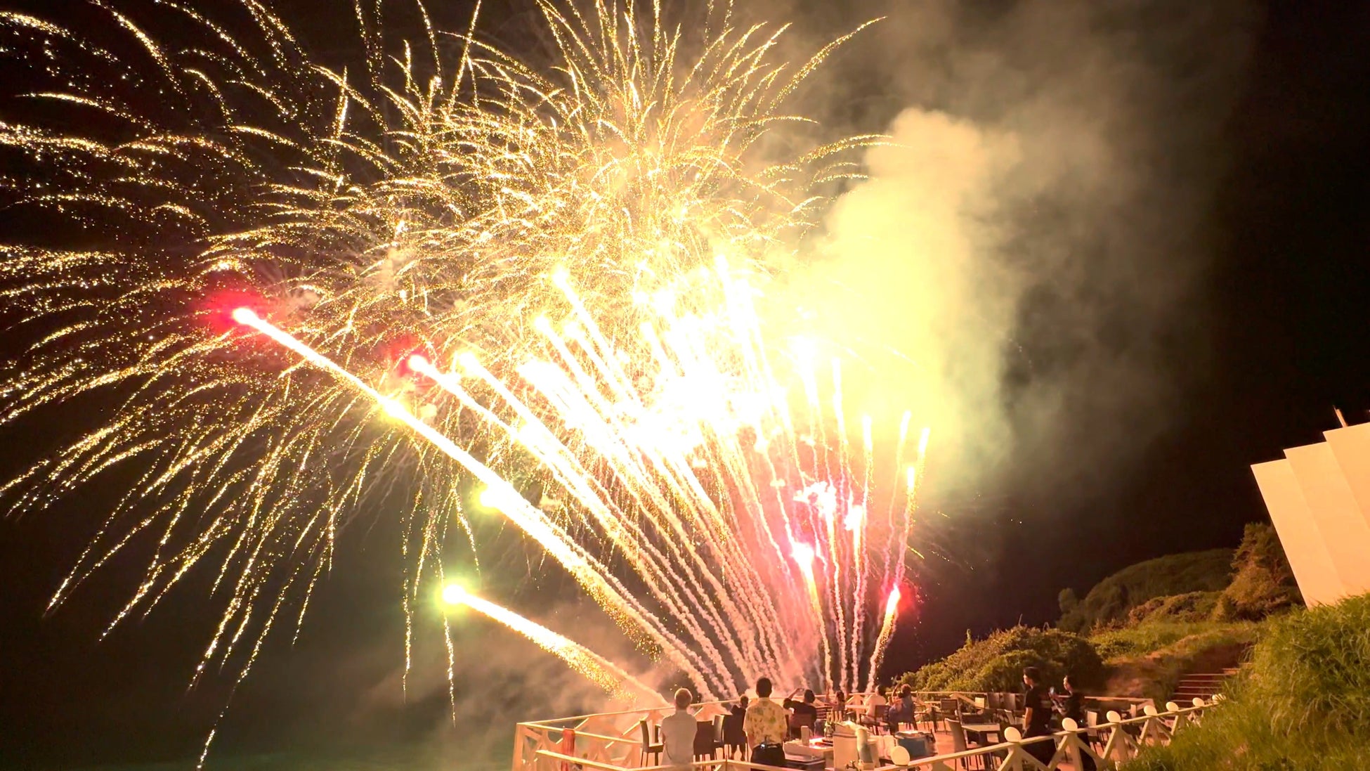 ホテルとビーチの間にある「オーシャンフロントテラス」は当ホテルの絶景が一番楽しめるスポットです。打上げ花火の保安距離を確保したテラスにテーブル席を8席用意し、間近に打ちあがる花火を見ることができます。打ち上げが始まるまでの時間には、フィンガーフードとスパークリングワインや生ビール、ノンアルコールドリンクなどを楽しめます。