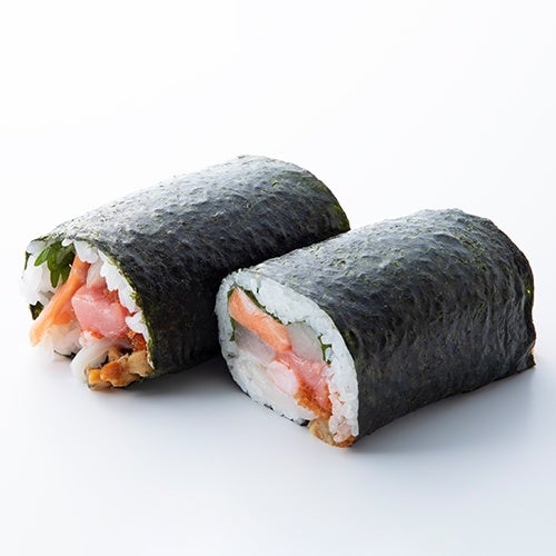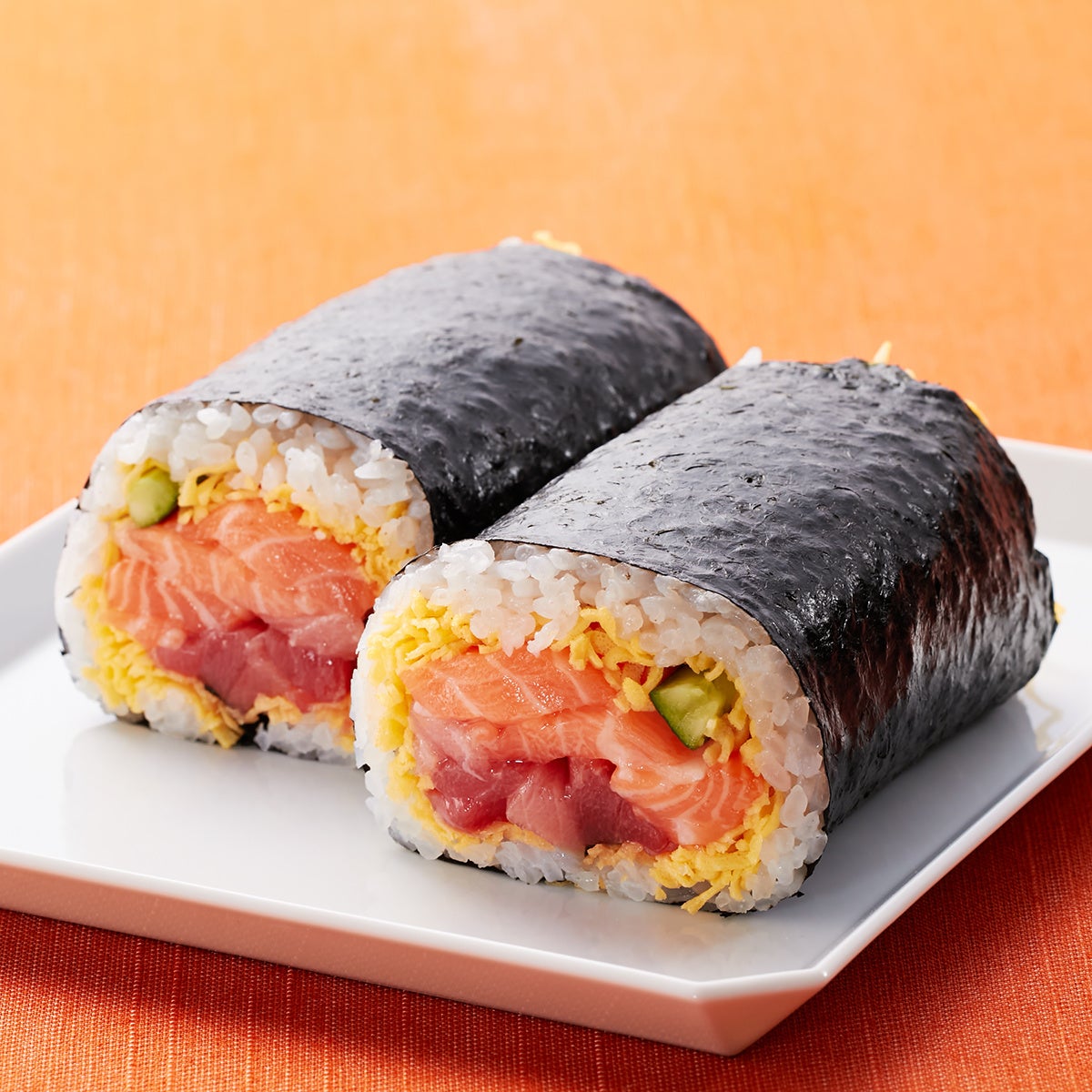 カラフルな食材を使用した断面も鮮やかな巻き寿司。人気のまぐろとサーモンがたっぷり入っています。