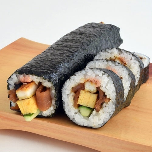 「永続」の意味を持つ長い姿の穴子に加え 「長寿」を表す干瓢、「金運」の玉子など緑起物の具材が入っている太巻です。