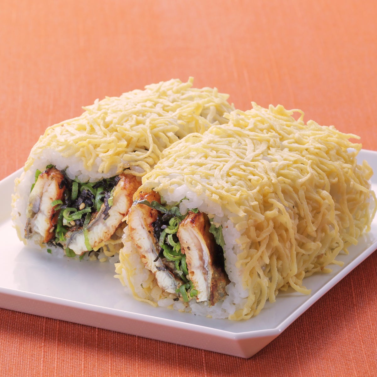 愛知県の名物ひつまぶしを巻き寿司にしました。そのまま食べても良し、お茶碗に入れてお出汁をかけると2度楽しんでいただける巻き寿司です。