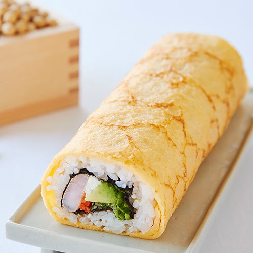 海老・アボカド・クリームチーズを甘みのあるふんわりした薄焼き玉子で包みました。