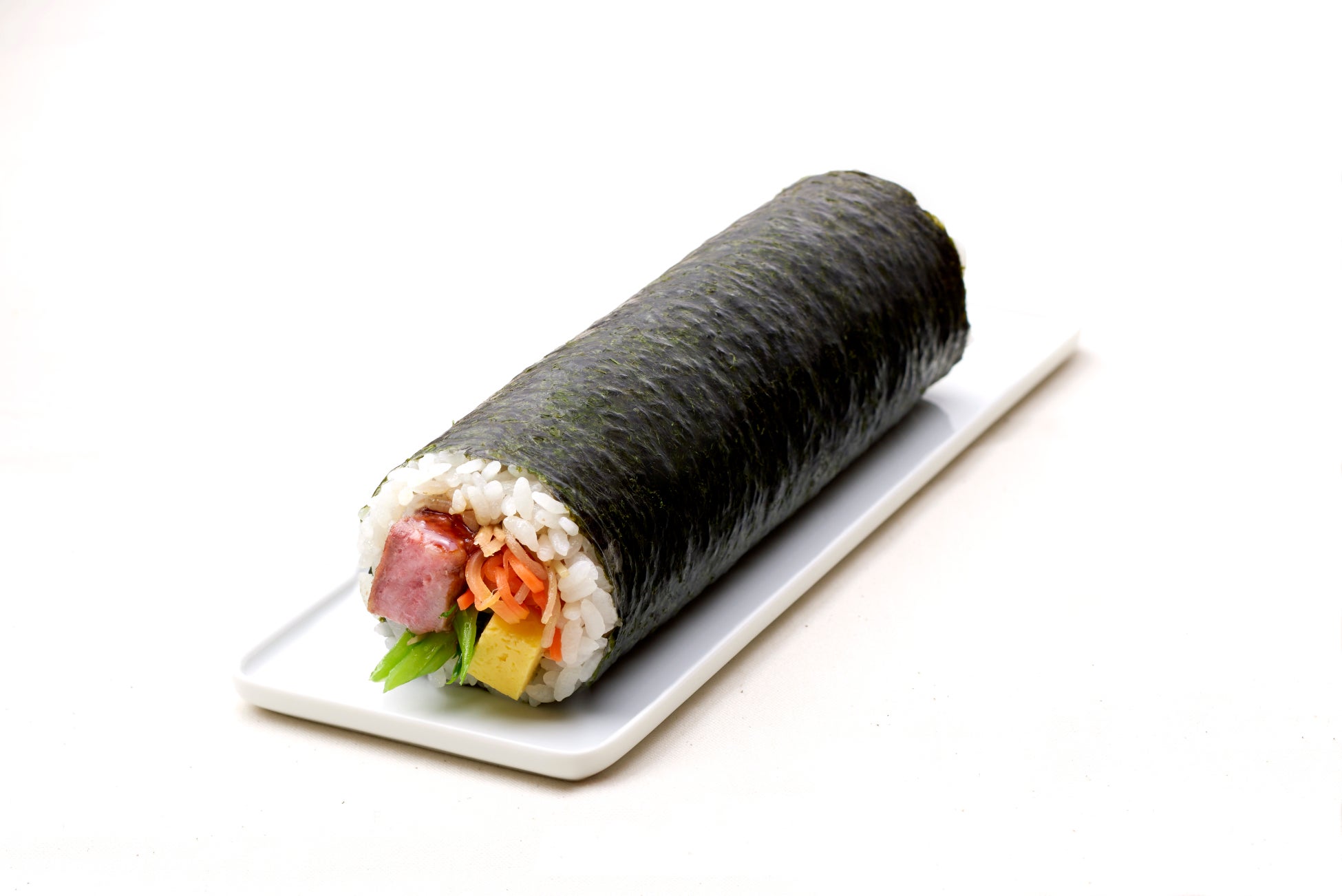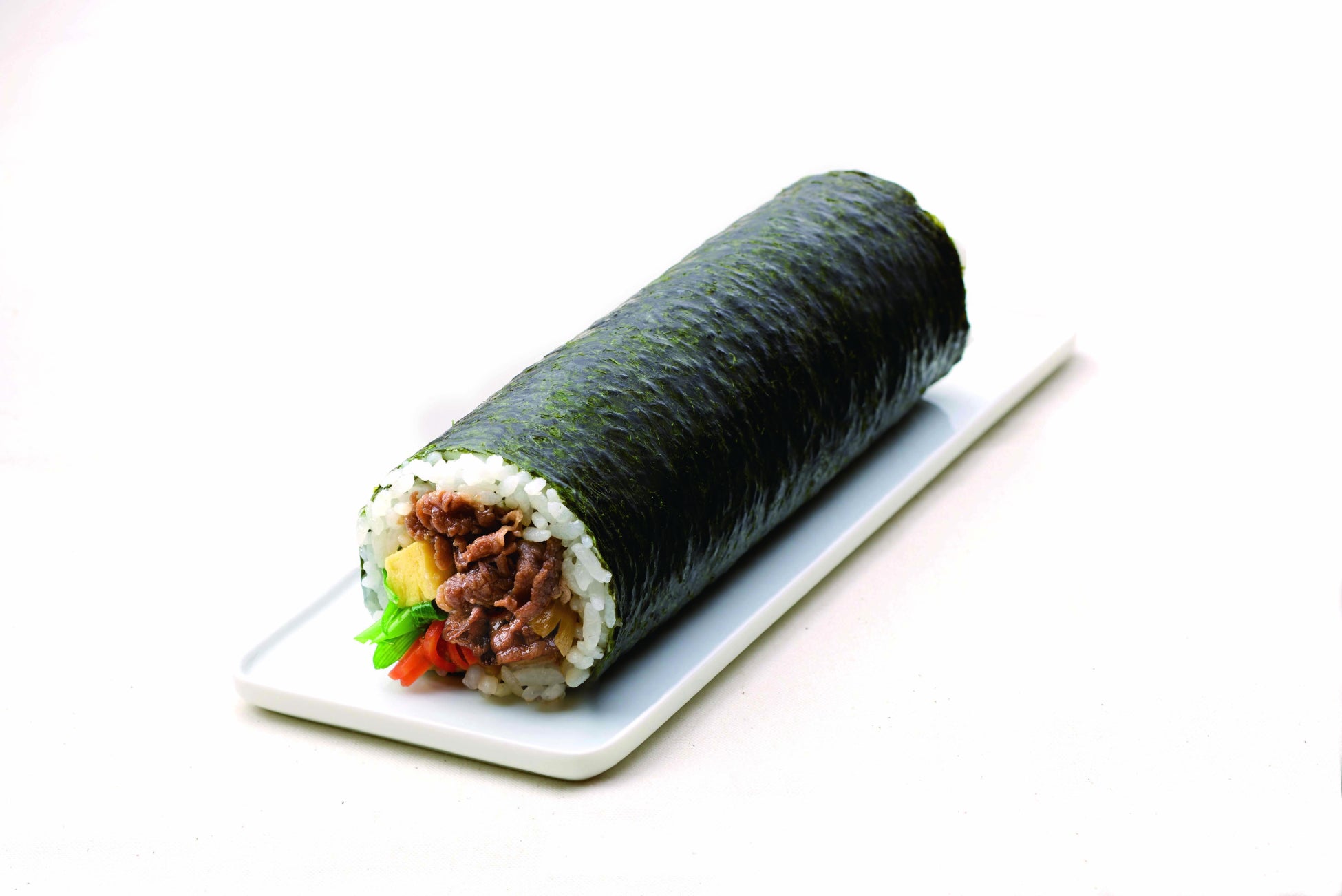 サランバン一番人気のキンパ。ごま油風味のごはんに柔らかい牛肉を特製プルコギタレで焼いて色とりどりの具材で巻き込みました!
