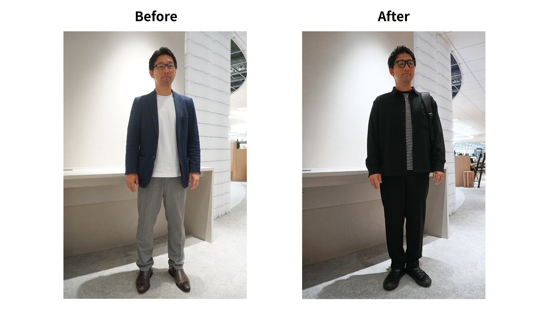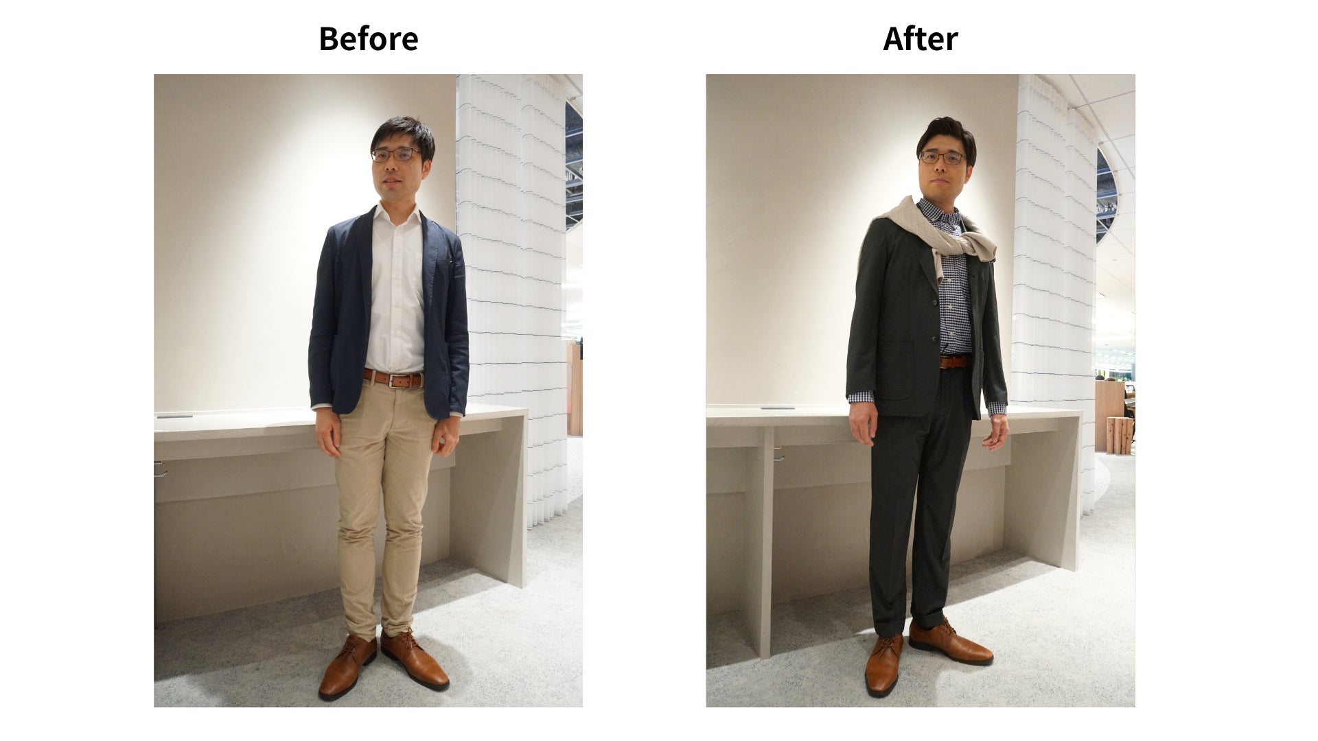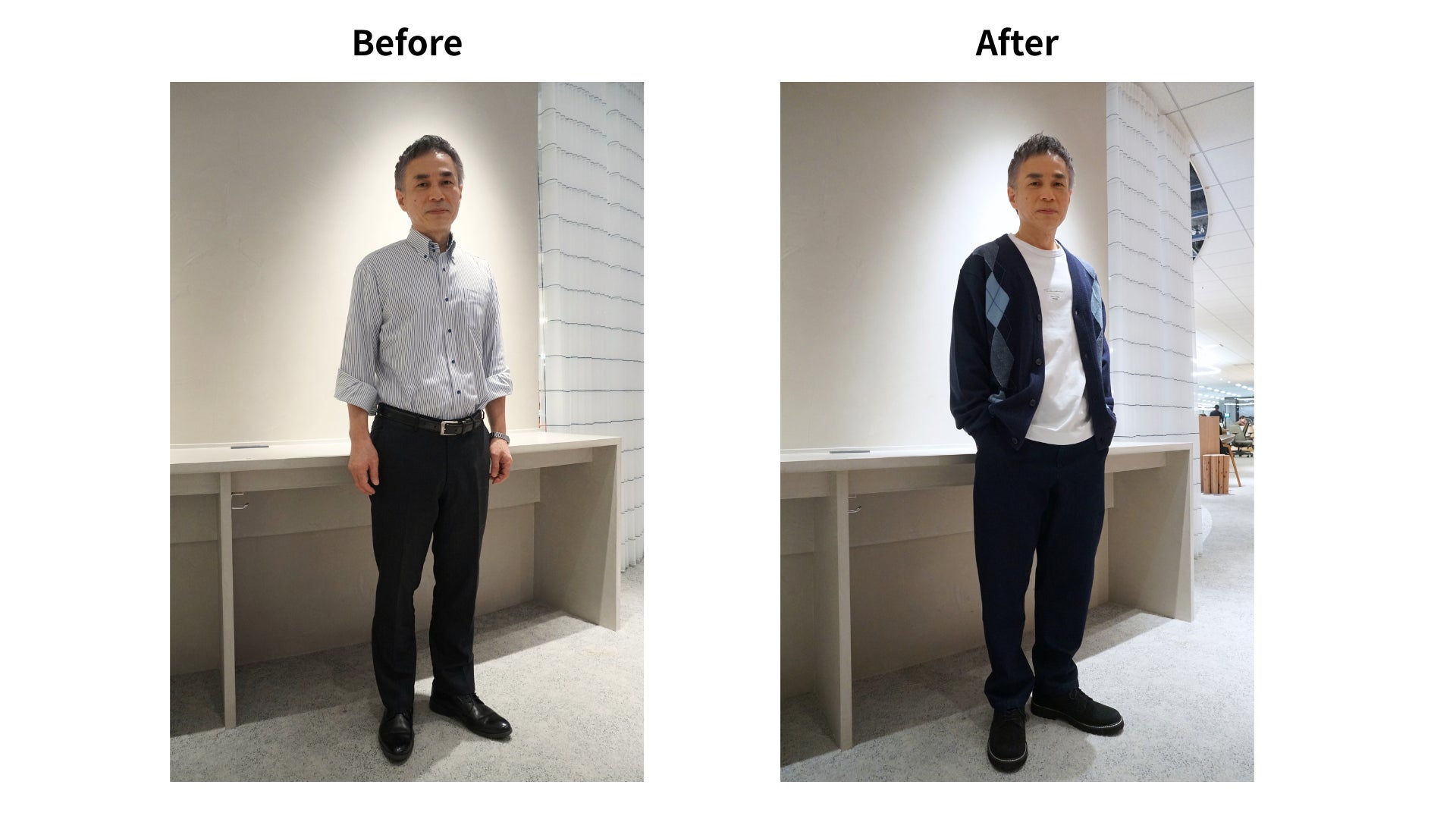 オカムラの社員6名がGLOBAL WORKのオフィスカジュアル服で変身。
