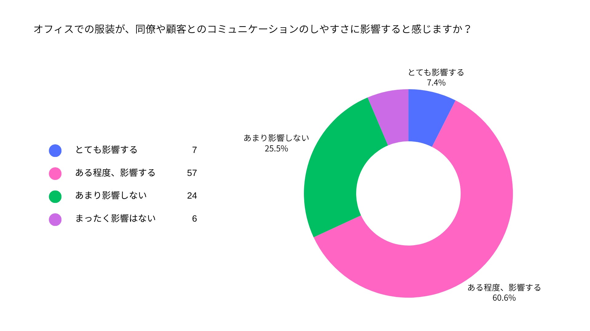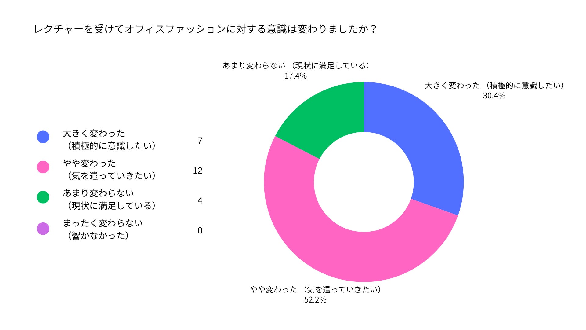 レクチャーを受けて「オフィスカジュアルに対しての意識が変わった」と答えた社員は8割以上に上り、マインドセットの変化が確認されました。また、イベント後に「オフィスでの服装に自信がある」と回答をした人は約5割の結果となり、イベント前からの改善が確認できました。さらに、実施後のアンケートに回答した全員が、「オフィスカジュアルな服装が同僚や顧客とのコミュニケーションのしやすさに影響する」と回答しました。服装が単なる身だしなみではなく、組織内の円滑な関係構築の要素になるという認識が浸透されました。