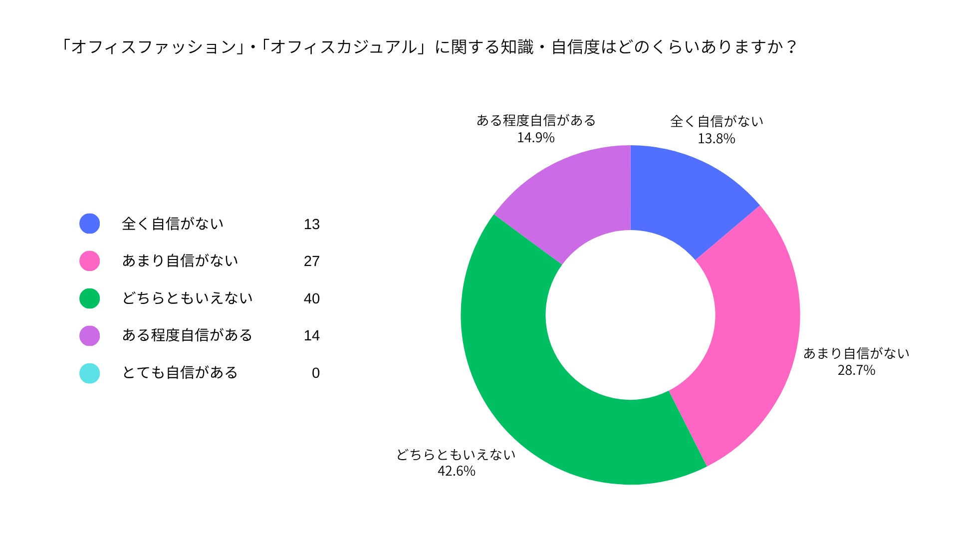 今回、ワークショップを開催した東京都港区にあるオカムラのオフィスに勤務する社員94名を対象に事前に実施したファッションに関するアンケートでは、「オフィスでの服装に自信がある」と回答をした人は2割にも満たない結果となり、多くの人がオフィスでの服装に自信が持てていないことがわかりました。また「オフィスでの服装が同僚や顧客とのコミュニケーションのしやすさに影響する」と回答した社員は7割近い結果となりました。同じ職場にいても職種が多岐にわたるような場合には、服装選びへの障壁が、異なる部門でのフラットなコミュニケーションにおいて壁となることも多いことがわかりました。