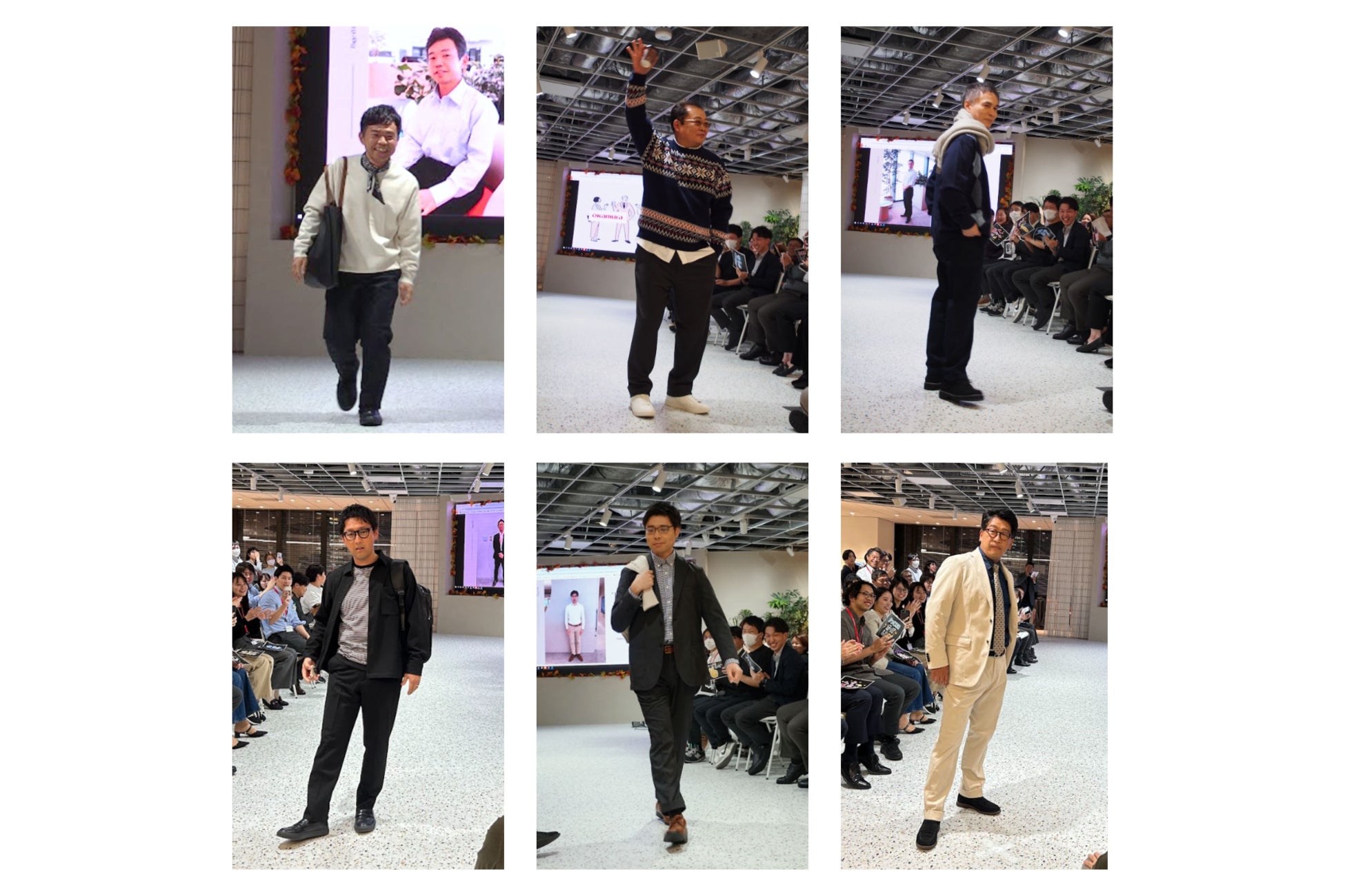 GLOBAL WORKの支援のもと、オカムラのオフィスにて社員に向けて、オフィスカジュアルについて理解を深めるワークショップを開催。参加者が服装の判断基準を統一し、部門や職種を超えた社員間のコミュニケーションが生まれるようなプログラム構成の1時間。GLOBAL WORKの服でコーディネートし、実際に社員が変身する参加型のファッションショーが見どころとなりました。