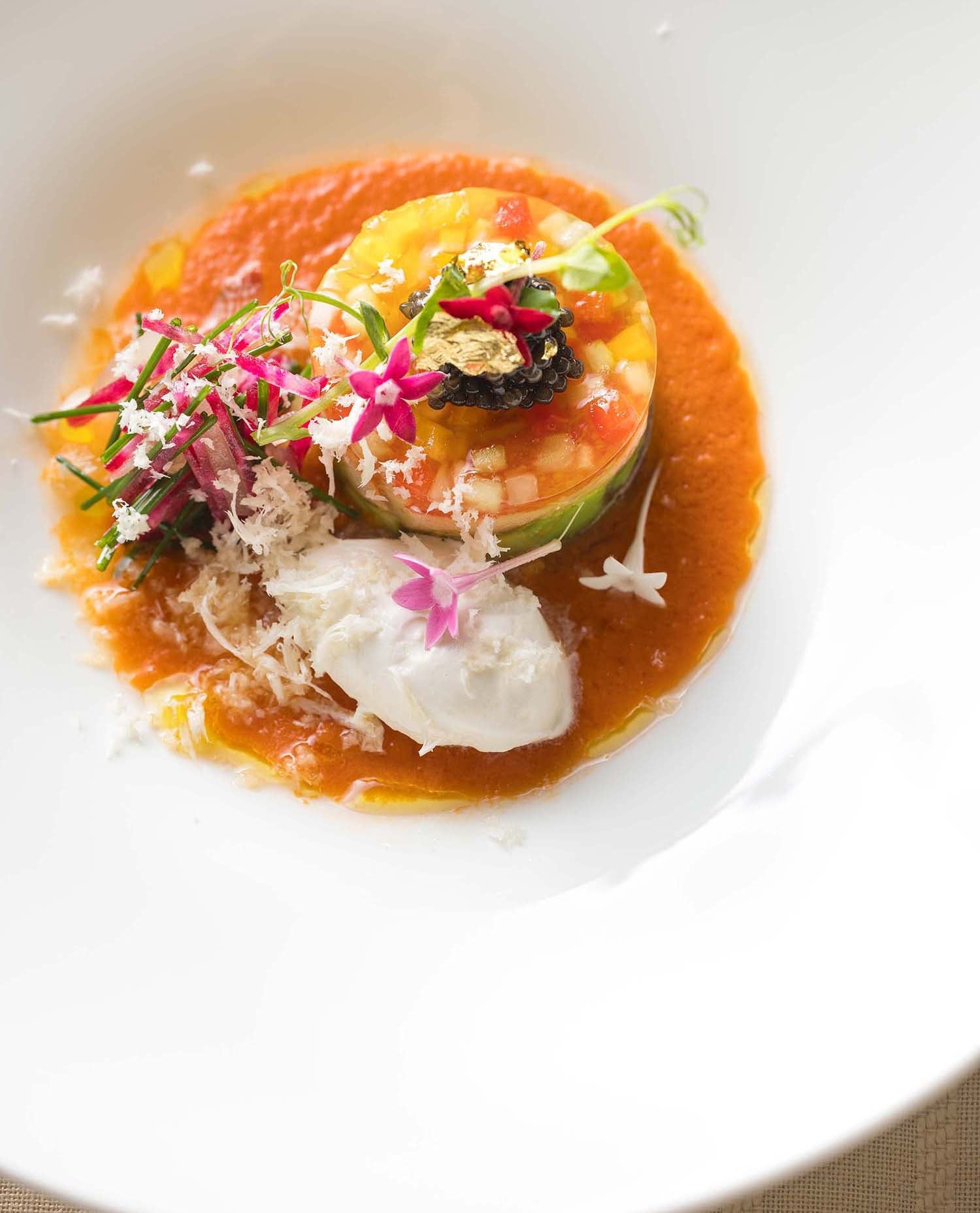 前菜「ズワイガニとアボカドのガスパチョ キャビア添え クリスマス風」 ほか