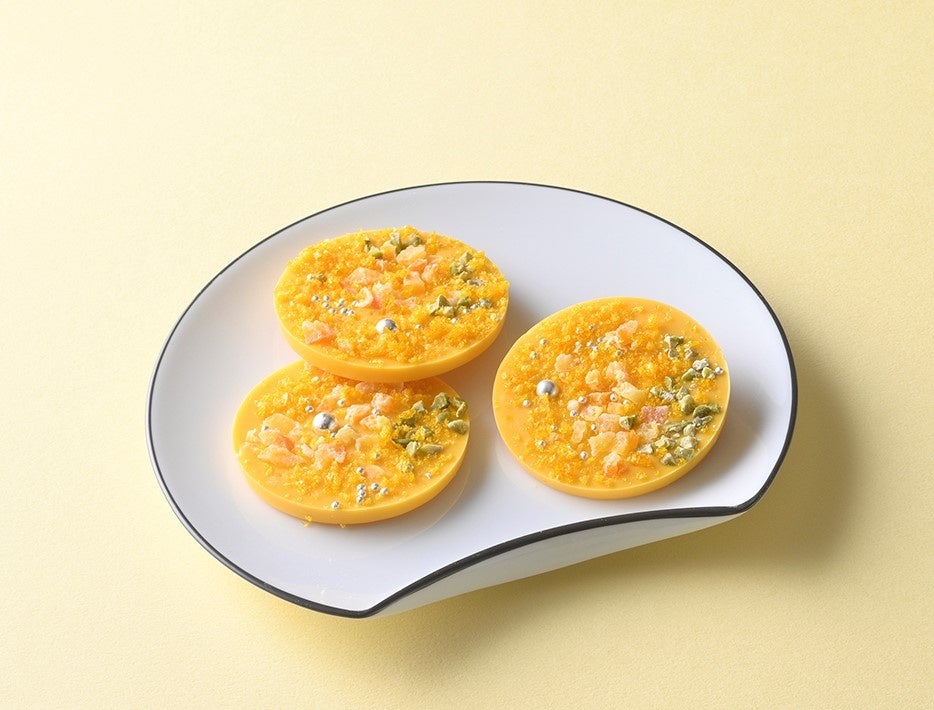 柑橘風味のチョコレートに、ドライネーブルやマンゴーをデコレート。上品なミモザカラーの限定パレショコラです。