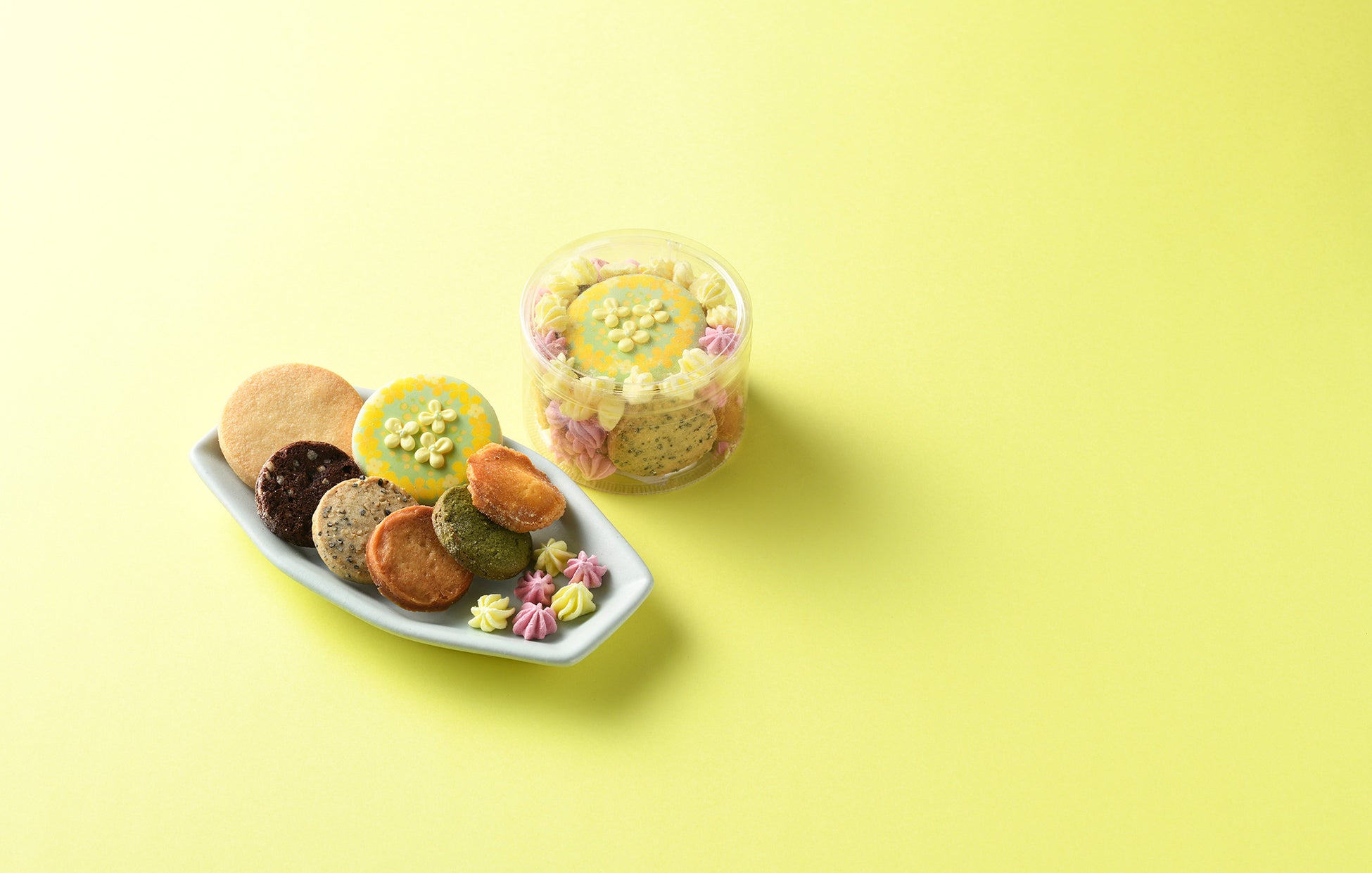 菜の花をモチーフにした限定のアイシングクッキーなど、和の素材を使用したクッキーとメレンゲを詰合せ。