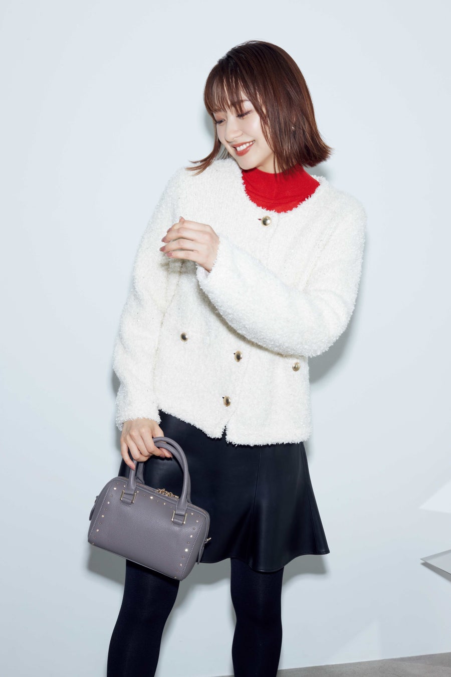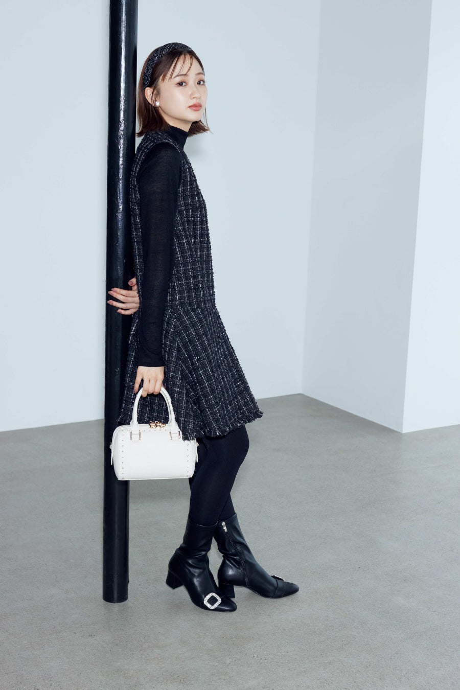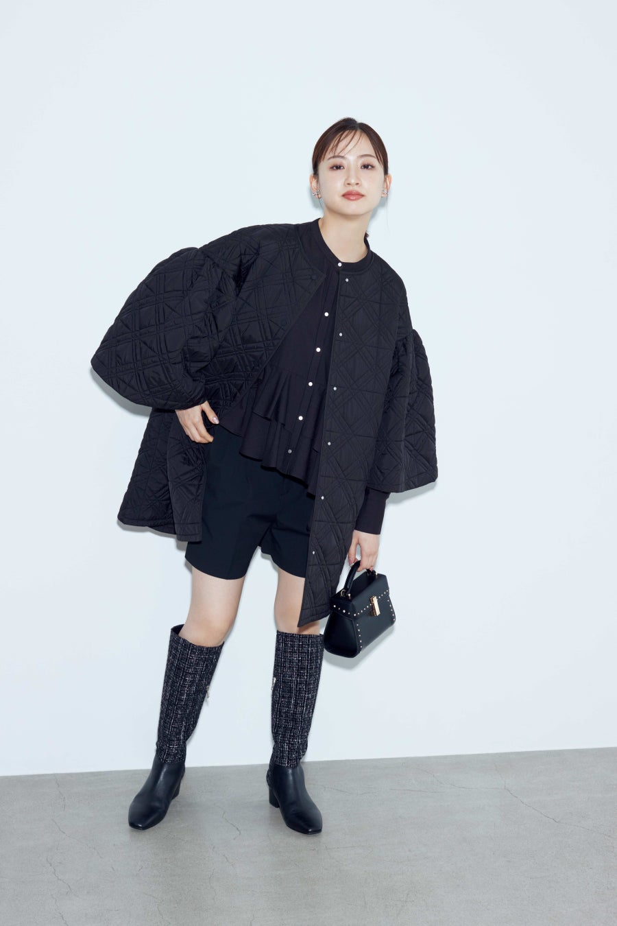 ブーツやタイツが味方になる季節にこそ取り入れたいミニ丈ボトムを、品位ある佇まいで魅せてくれました。