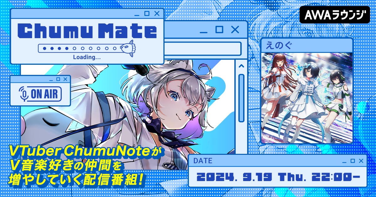 AWA株式会社(本社:東京都港区、代表取締役CEO:冨樫晃己)が運営する、サブスクリプション型(定額制)音楽ストリーミングサービス「AWA(アワ)」は、2024年9月19日22:00~23:00の1時間に渡り、無料で誰でも参加できるオンライン空間「ラウンジ」で、VTuberのChumuNoteがゲストアーティストと共に楽曲を深掘りし、V音楽好きの仲間を増やしていく音楽番組『ChumuMate』の第1回を開催いたします。