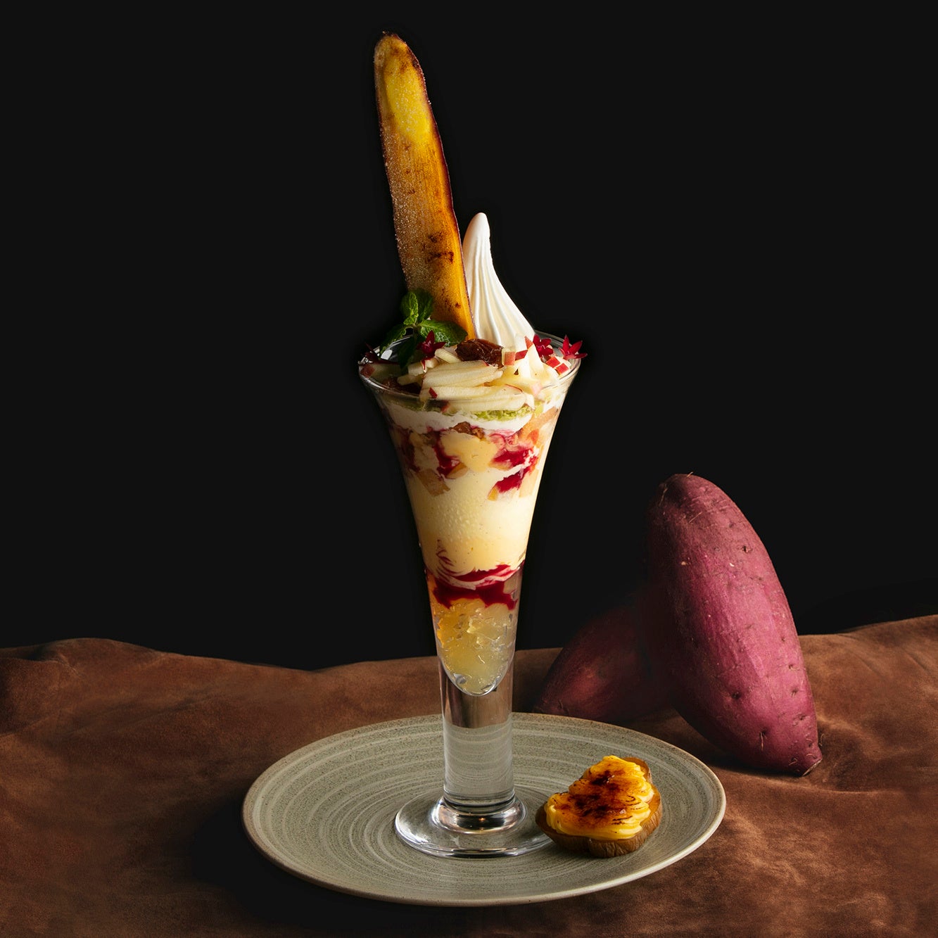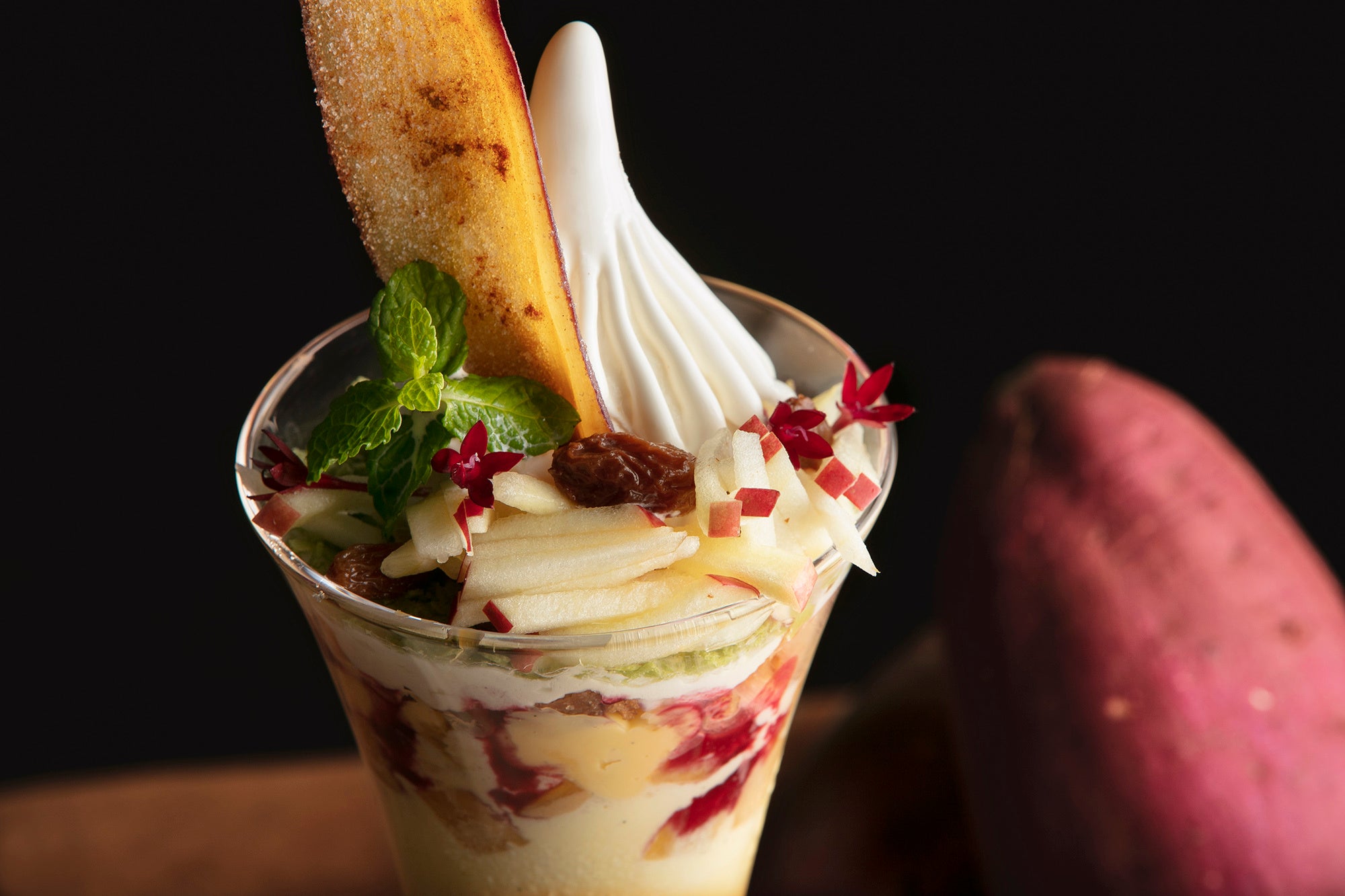 サツマイモのしっとりとした甘さとリンゴの爽やかな酸味による対比的でありながらも絶妙なコンビネーションや、ブリュレやラムレーズンアイスクリームなどクリーム系のコク、ほかにもカシスソースや塩キャラメルソースなど、パフェを構成する10以上の内容のそれぞれが、味の個性を主張しつつも見事な調和を織りなし、まさに“計算尽くしのパフェ”です。