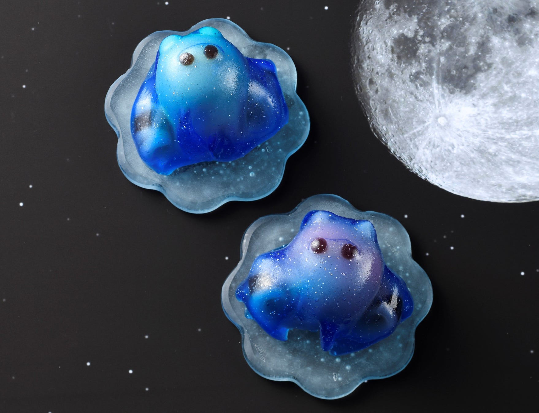 ダークブルーの宇宙空間に見立てたクリアな錦玉の中に、伝統的な和菓子素材であるこなし製の月と地球を浮かべました。星々が煌めく壮大な宇宙のワンシーンが、ジュエリーのような美しさで表現されています。
