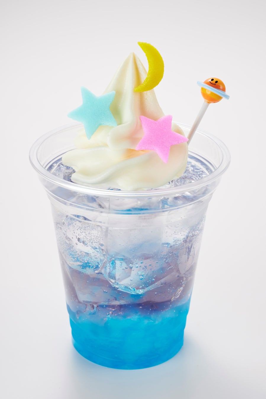 宇宙空間をイメージした“謎味のクリームソーダ”は、シュワシュワしたソーダ水と甘いソフトクリームが刺激的。月と星を象った雲平(砂糖と粉にしたもち米を混ぜて作ったお菓子)をトッピング。