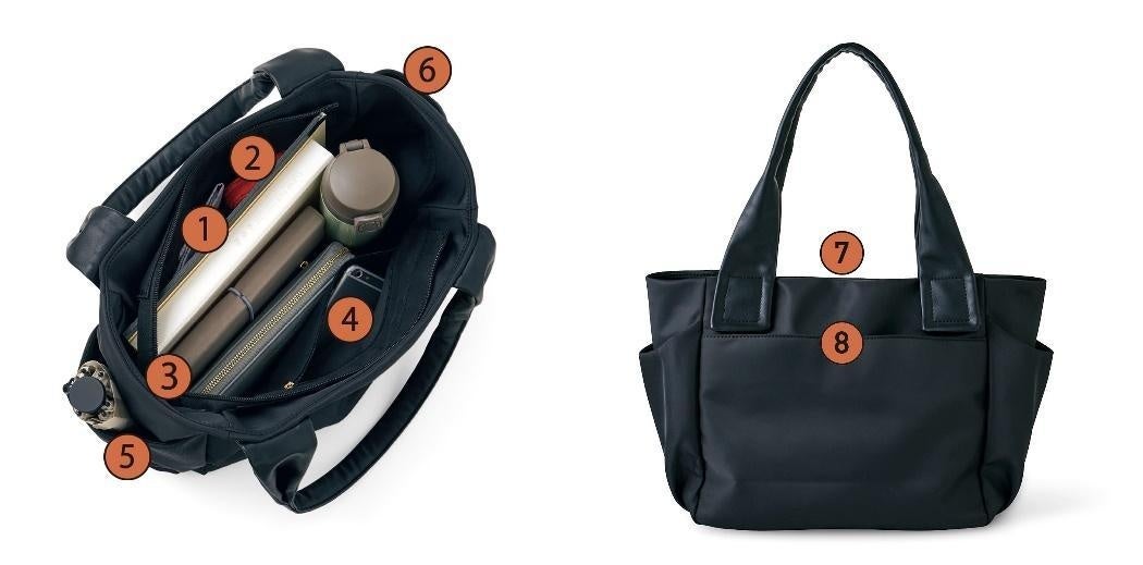 花粉が生地目に付きにくく、落ちやすい高密度なポリエステルを使ったバッグ。充実の8つのポケットで仕分けもしやすく、大容量なので、通勤にはもちろん一泊旅行にも持っていけます。上品な印象を高める合皮の持ち手はやわらかく、肩の負担も軽くなっています。