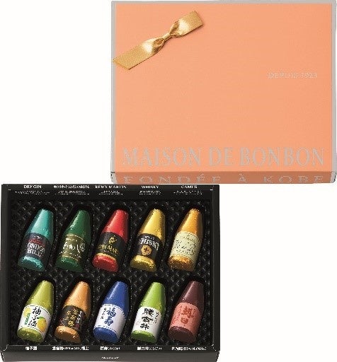 ドライジンや梅酒、純米吟醸など、洋酒と和酒10種類のボトル型ボンボンショコラを詰め合わせました。