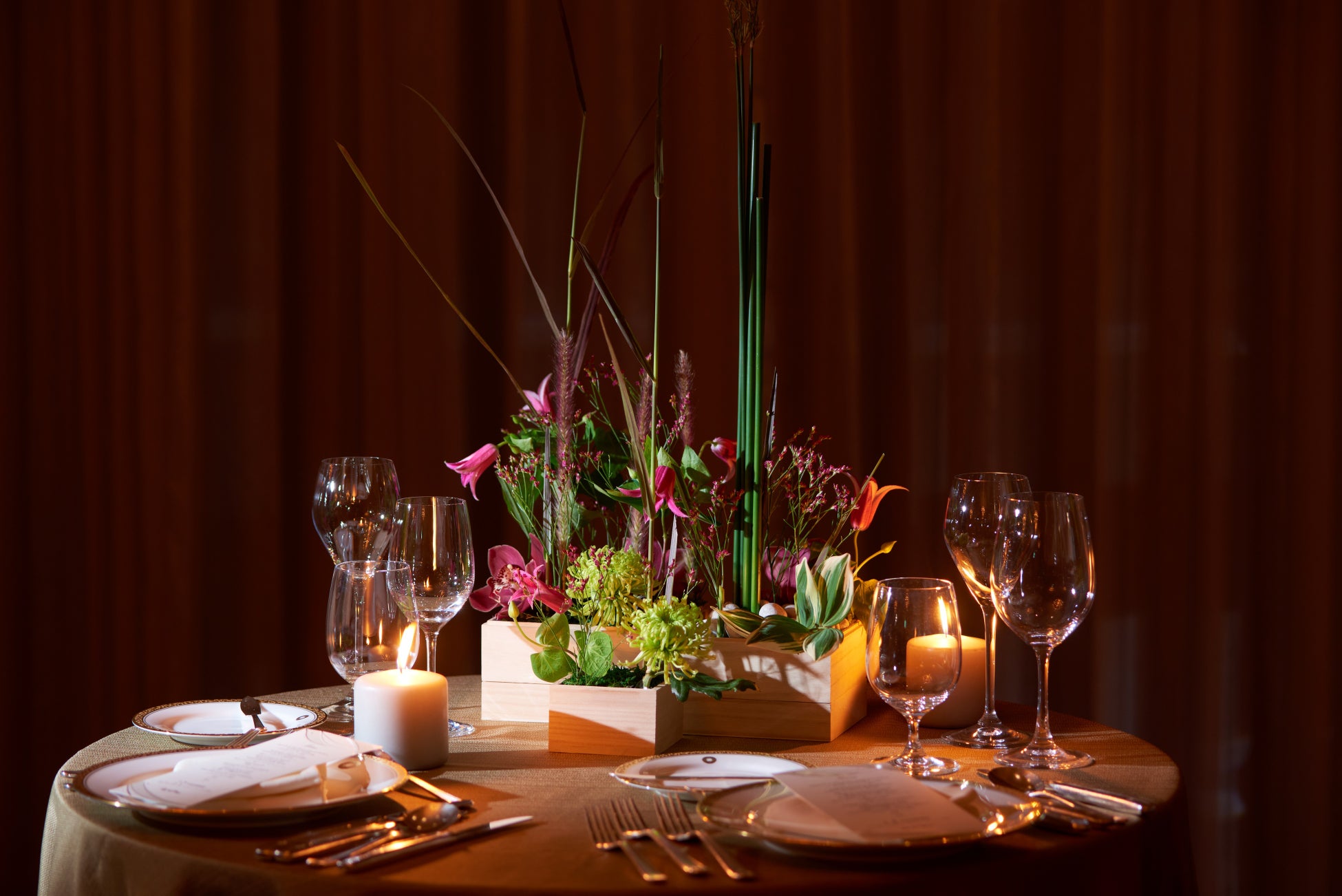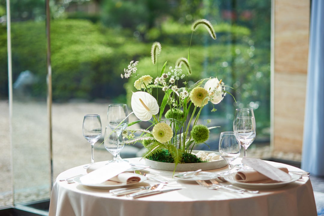 「ジャパネスクモダン」に生まれ変わった「PALAZZO OTANI」にふさわしいフラワーアレンジメントを2種ご用意。ナチュラルでありながら、鮮やかなボルドーが魅力的な『凛-RIN-』は、ナイトウエディングをさらに上質に魅せるデザインに仕上げました。窓外に臨む日本庭園と調和する『結-YUI-』は、自然光が差し込む昼間のウエディングに最適です。結婚式の時間に合わせてお選びいただけます。