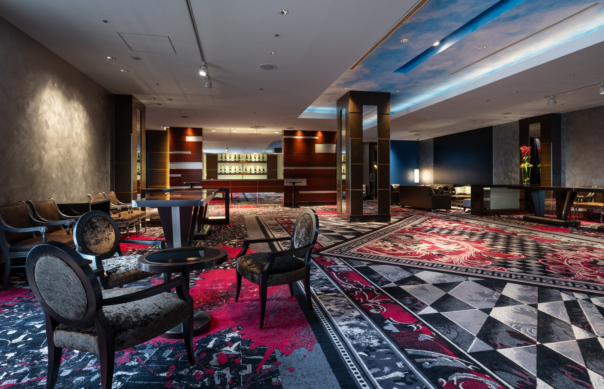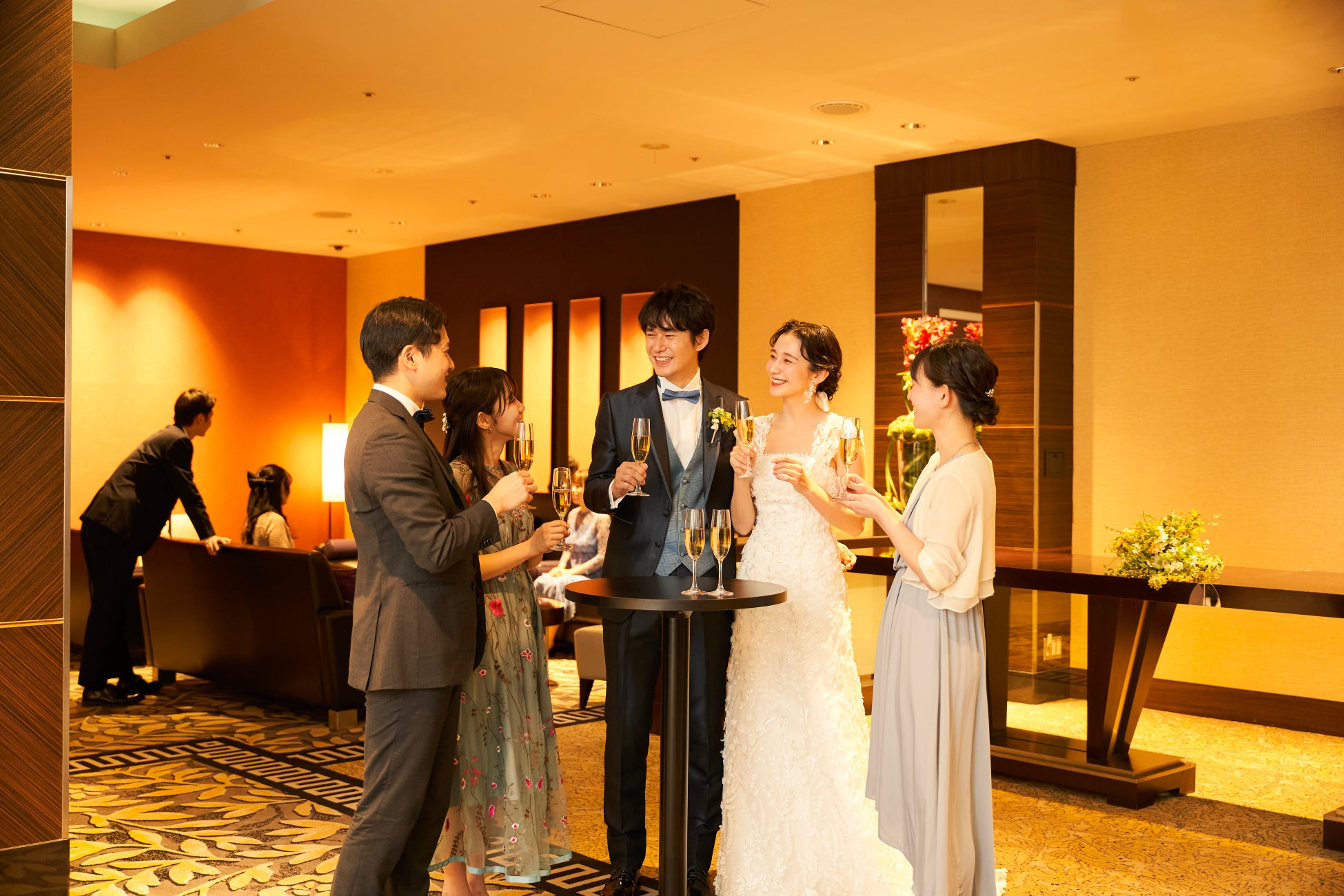まずゲストが案内されるのは、披露宴会場に隣接した「プライベートラウンジ」。職人が手間暇かけて織り上げた最上級のカーペットに、ゆったりと腰かけられるソファ、奥にはバーカウンターが完備された空間が広がります。