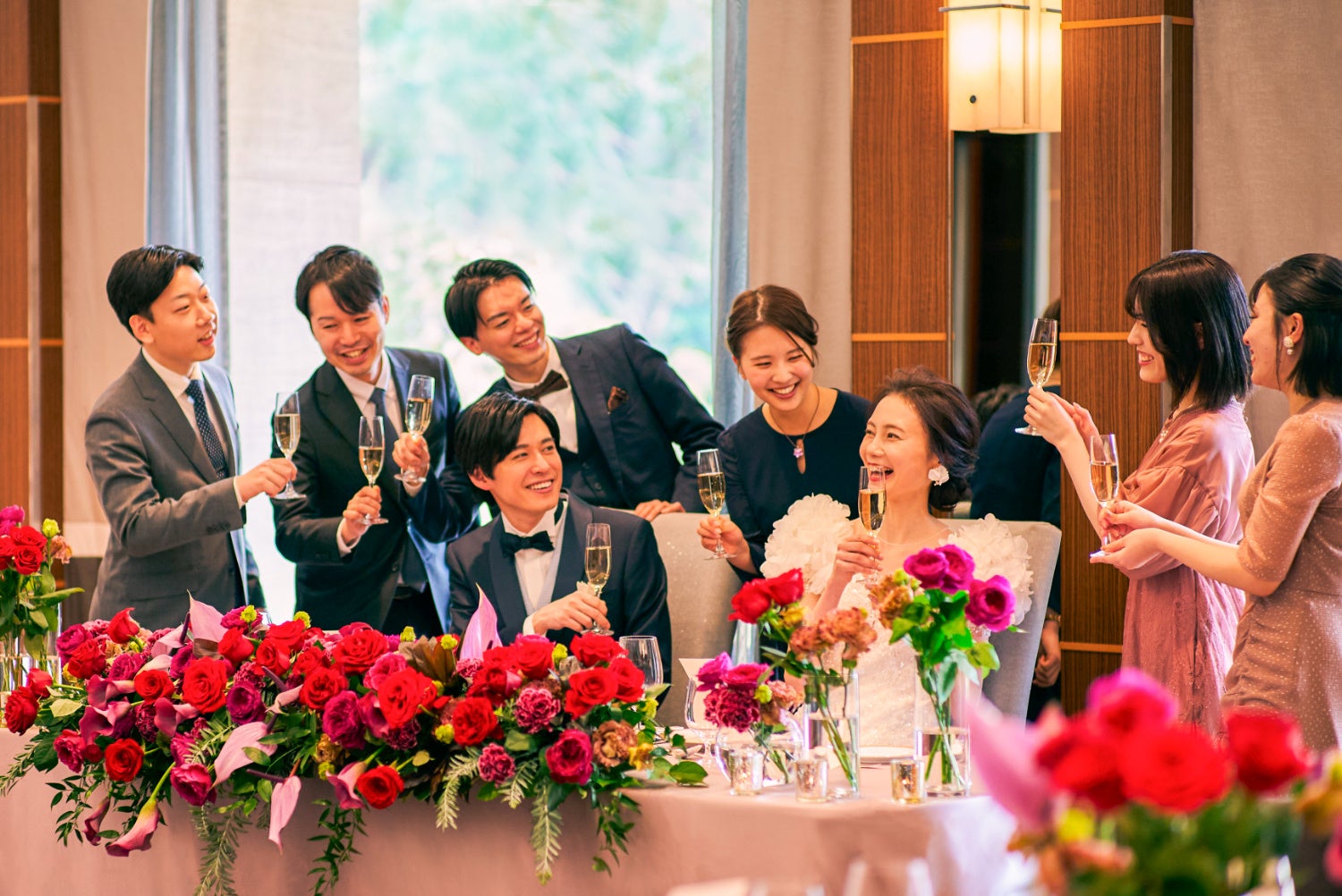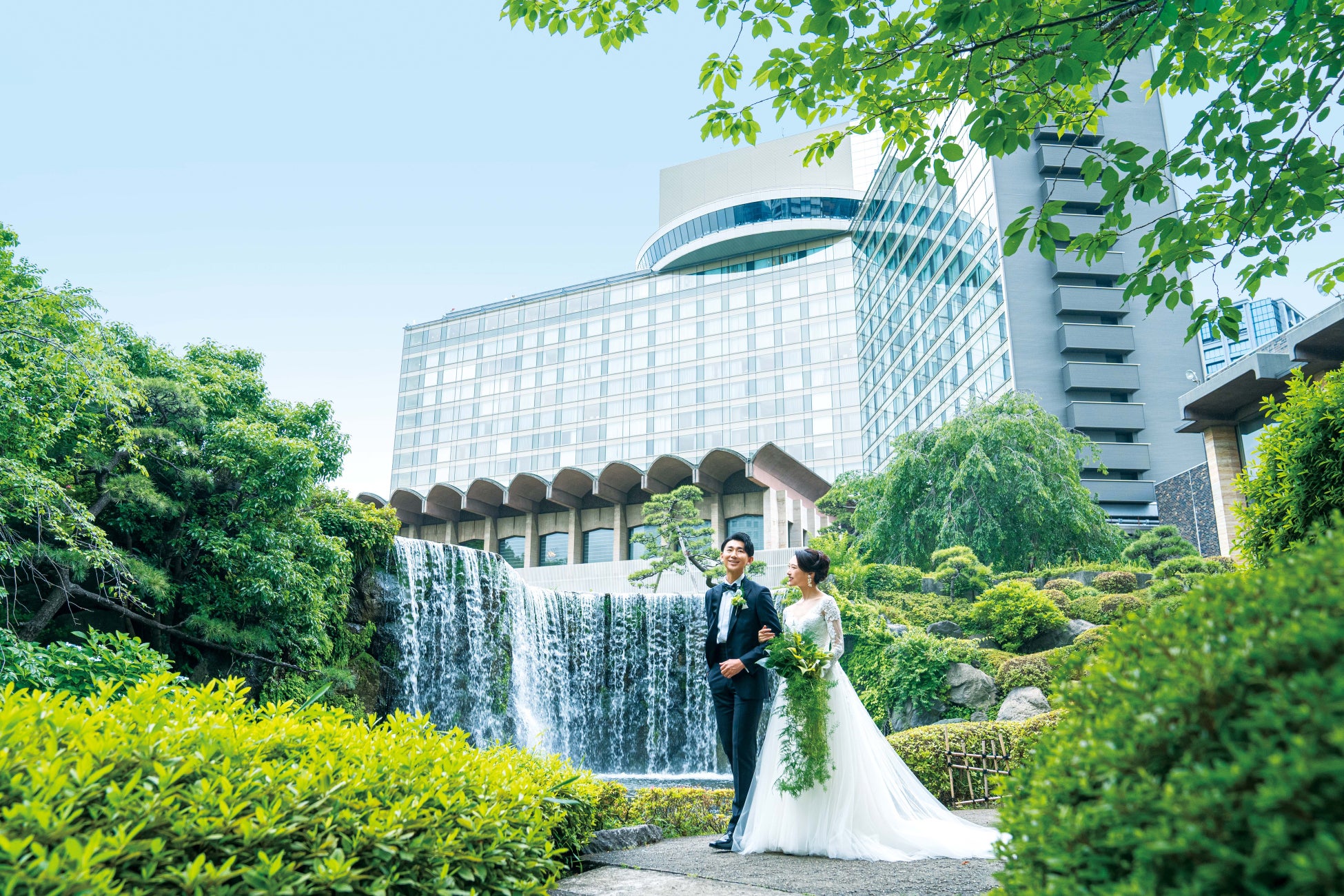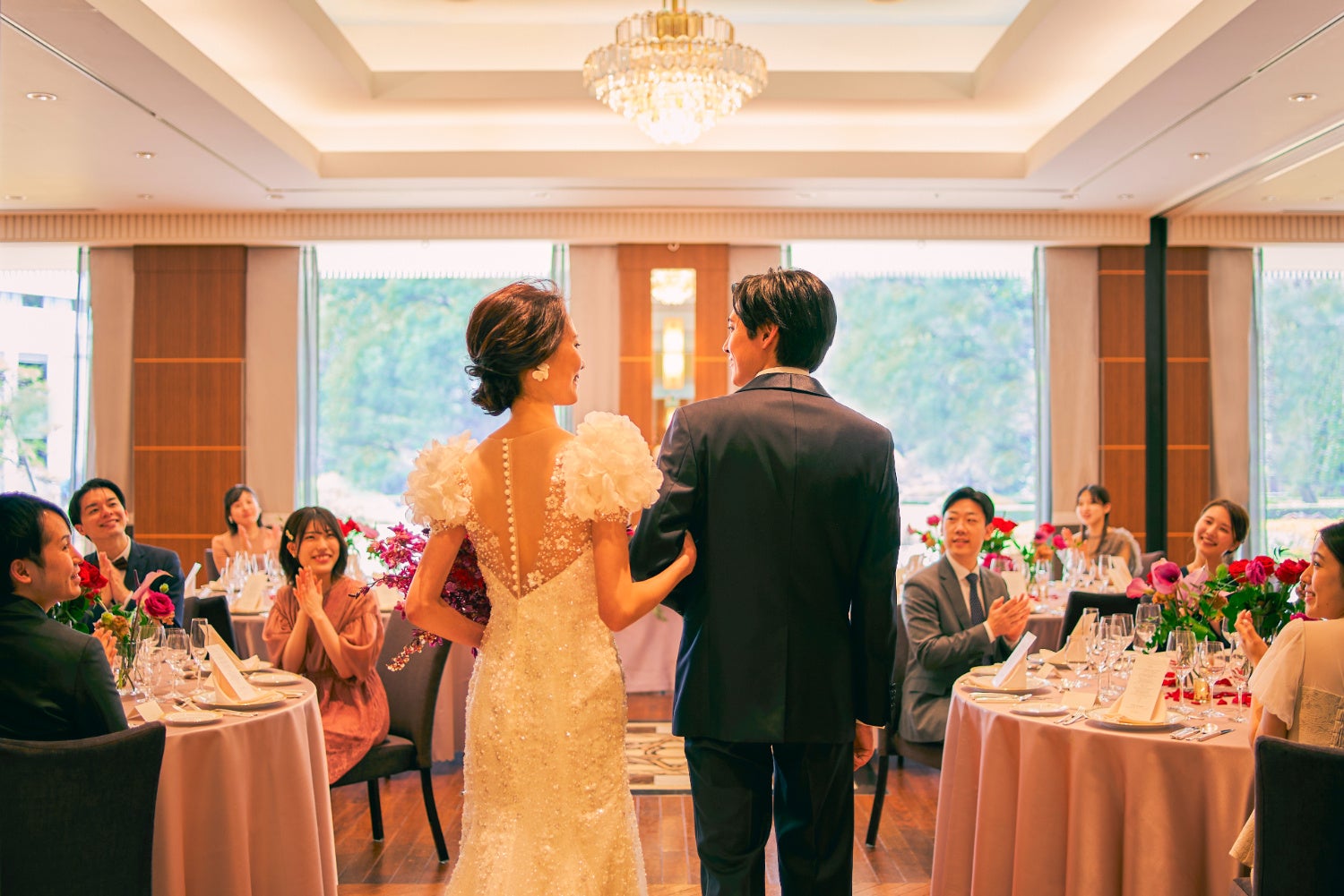 昼間は緑を臨む約1万坪の広さを誇る日本庭園では、現在ホテル開業60周年を記念して「フルカラーライトアップ」を実施中。披露宴の最中、ゲストもうっとりするような“光のおもてなし”を堪能して。