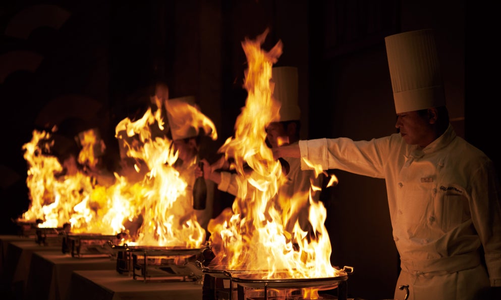 メインの肉料理では、会場内のオープンキッチンにシェフが登場。その場で肉に火入れをし、クライマックスで一斉にフランベパフォーマンスを行います。燃え上がる炎の迫力と、芳ばしい香りが会場中を包みます。