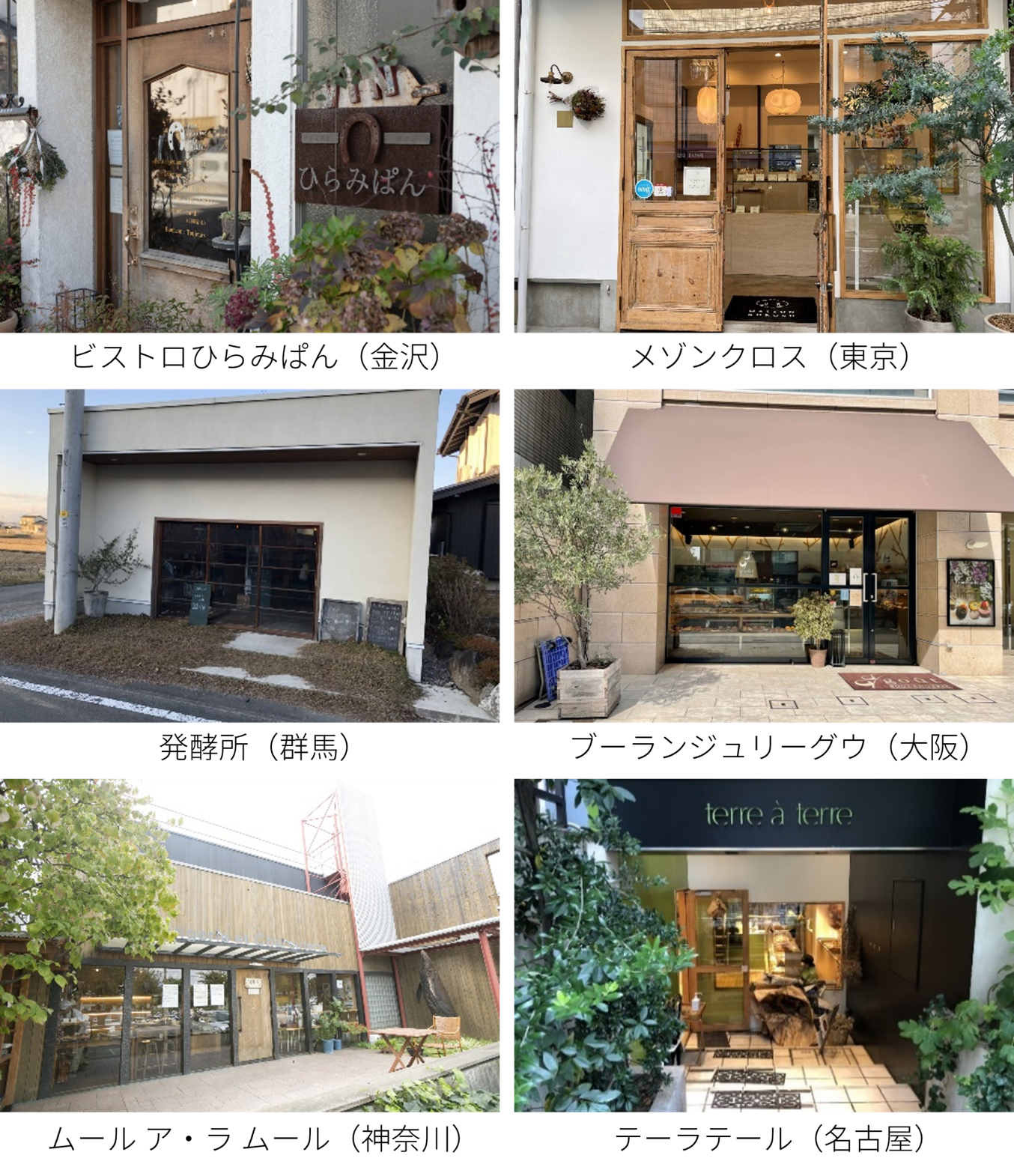 TOLO PAN TOKYO(池尻大橋)、パンとコーヒー 馬場FLAT(高田馬場)、ザ リトル ベーカリー トーキョー(原宿)、メゾン・ランドゥメンヌ(麻布台)、ブーランジェリー ブルディガラ(広尾)、MAISON KUROSU(用賀)、ロータスバケット(目黒)、かいじゅう屋(葛西)、ムール ア・ラ ムール(伊勢原)、セテュヌボンニデー(向ヶ丘遊園)、パナデリア・シエスタ(こどもの国)、BREAD IT BE(鎌倉)、川越ベーカリー 楽楽(川越)、ブーランジュリー コトン(鶴瀬)、ベーカリーハイジ(鎌ヶ谷大仏)、ベッカライ タガミ(栃木)、THE STANDARD BAKERS(栃木)、WANDERLUST(群馬)、発酵所(群馬)、パン工房 ぐるぐる(茨城)、CROFT BAKERY(群馬)、Matsumotopan(長野)、石窯パン工房サフラン(新潟)、テーラ・テール(名古屋)、メゾンブルー(名古屋)、坂の上ベーカリー(金沢)、ビストロ ひらみぱん(金沢)、ノトヒバカラベーカリー(金沢)、ブーランジュリーグウ(大阪)、PAINDUCE(大阪)、ブーランジュリオノ(兵庫)