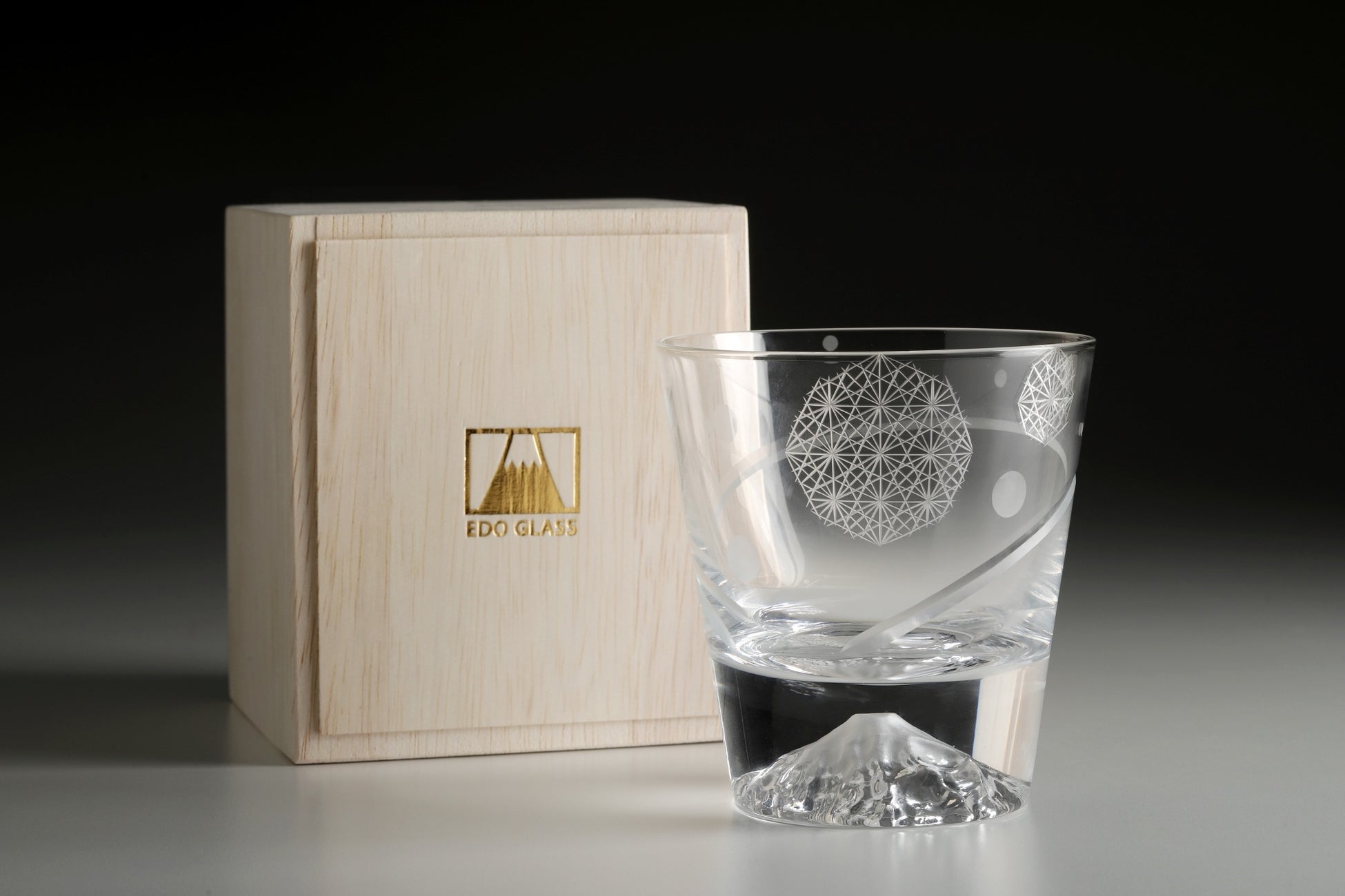 「富士山・プレミアムグラス 灯」は、日本の象徴である富士山をモチーフにした、人気の高いロックグラス。グラスの底に施された、江戸切子の代表的な紋様「菊繋ぎ」が、光を受けて美しく輝く、優美なデザインです。