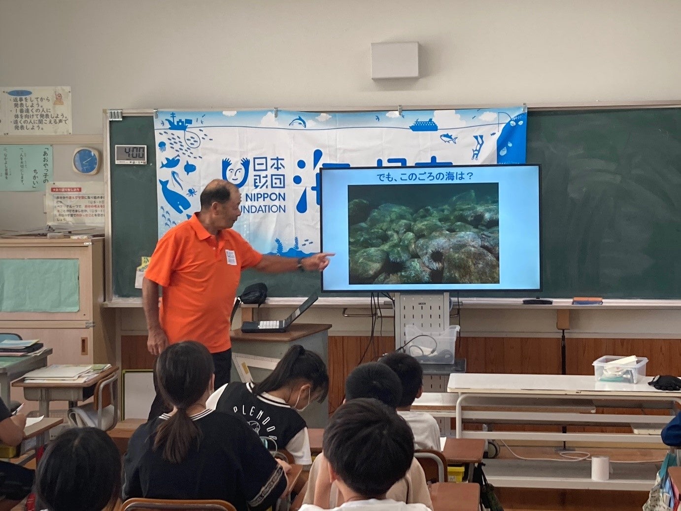 まずは地元鳥取の海のことを知ってもらうため、藻場を知るための勉強会を実施しました。地元のきれいな海には多様な海藻が群生する「藻場」が存在しており、「藻場」は①魚貝類の産卵場、②稚魚の保育場、③餌の提供、④餌となる生物の提供、⑤水質の浄化、⑥二酸化炭素の吸収、⑦酸素の放出といった様々な役割があり、「藻場」が無くなると魚の住処がなくなるため、漁業にも深刻な影響がでてきます。その「藻場」がムラサキウニの大量発生により消滅の危機に瀕しているという現状について、スライドで実際の海の様子を示しながら児童たちに説明しました。
