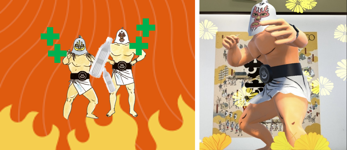 “サ勤交代公式プロレスユニット”の「サウナマンBros」が3Dになって出現し、制限時間以内にペットボトル飲料を投げて水分補給できれば“ととのい”成功エフェクトが見れるかも?!