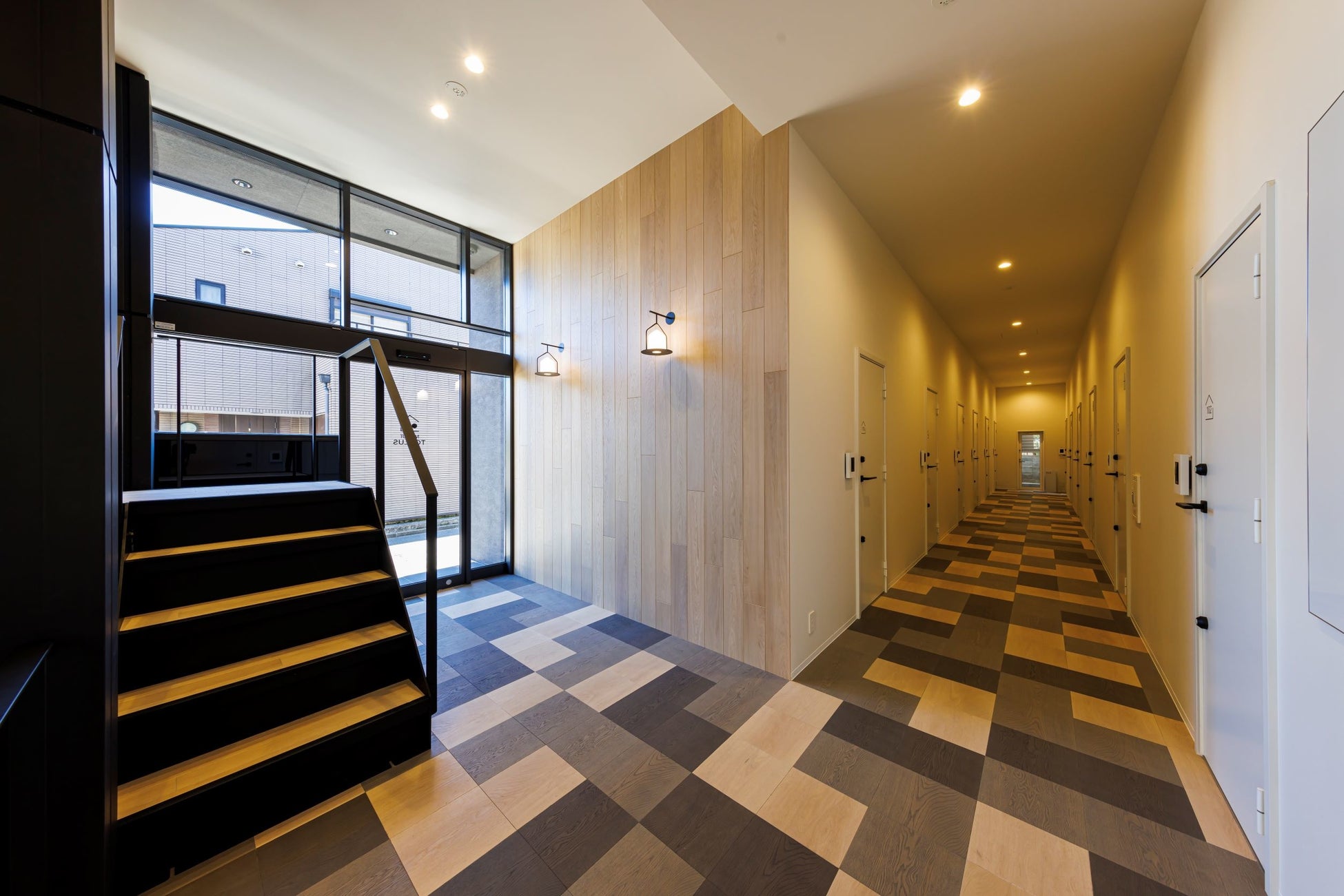 共用部は、シンプルで洗練されたデザインに仕上げながらも、木のぬくもりが感じられるリラックス空間をめざしました。地下1階には、入居者専用の共用ランドリースペースもご用意しています。