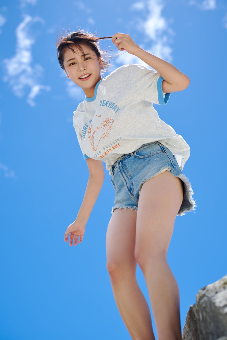 蜂がブンブン飛んでいるひまわり畑でギャーギャー騒いだり、海で蟹に追いかけ回されたり、でっかいヤドカリ同士が交尾しているのを見て笑ったり、今まで見たことのない位の大きな蜘蛛と遭遇して猛ダッシュで逃げたり、皆とアイス食べながら移動したり…… カメラを向けられた時は本気で臨み、オフの時はゲラゲラ笑って楽しいロケ撮影でした♡