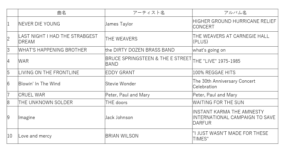 正直言って、残念ながら音楽にはそういう力はないと思います。でも聴く人に「戦争をやめさせなくちゃならない」という気持ちを起こさせる力はあります。今日は八曲か九曲の音楽をかけるつもりですが、それだけを聴き終えたとき、おそらくあなたは前よりも強く「戦争をやめさせなくちゃいけない」という気持ちになっているはずです。おそらく......。」