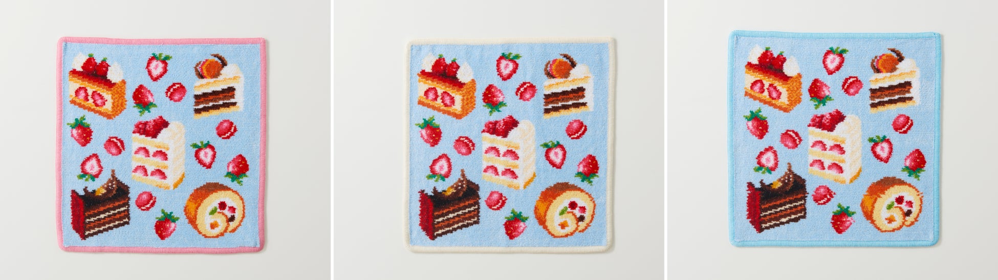 ハンカチの縁どりカラーは全3色で、いちごにぴったりの「ピンク」、なじみの良い「アイボリー」、差し色となる「ターコイズブルー」がラインアップ。