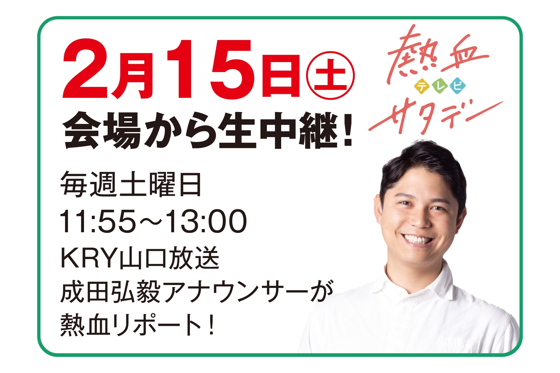 2月15日(土)、KRY山口放送「熱血サタデー」(11:55-13:00)、会場から生中継!成田弘穀アナウンサーが熱血リポートいたします。お楽しみに!