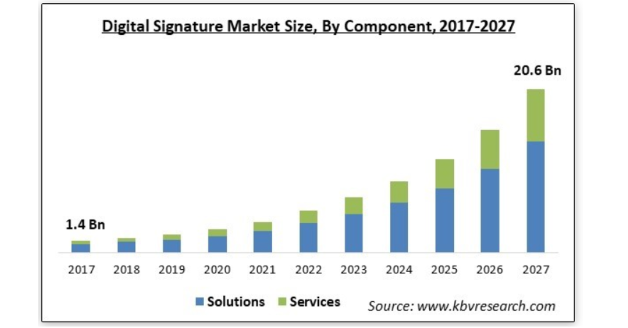 デジタル署名の市場規模は、2027年には206億ドル2,000万米ドルに到達する予測です。