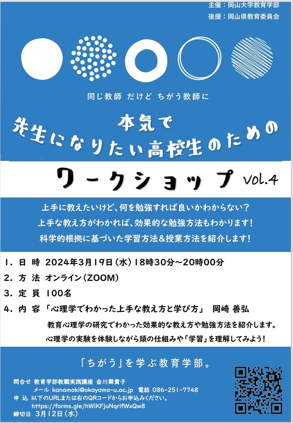 【岡山大学】岡山大学教育学部主催「第4回 先生になりたい高校生のためのワークショップ」〔3/19,水 オンライン〕