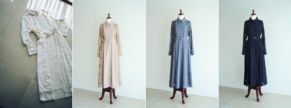 異素材の切り替えデザインとベルトで、立体感と上品さを演出。カフスや刺しゅうなどの細部にこだわることで、シンプルながらもきちんとした印象を与えます。スカートのサイドにあしらわれたシフォン素材とレース刺しゅうが、品よく軽やかなムードをプラスします。自分に似合うサイズが選べる3つの着丈をご用意いたしました。