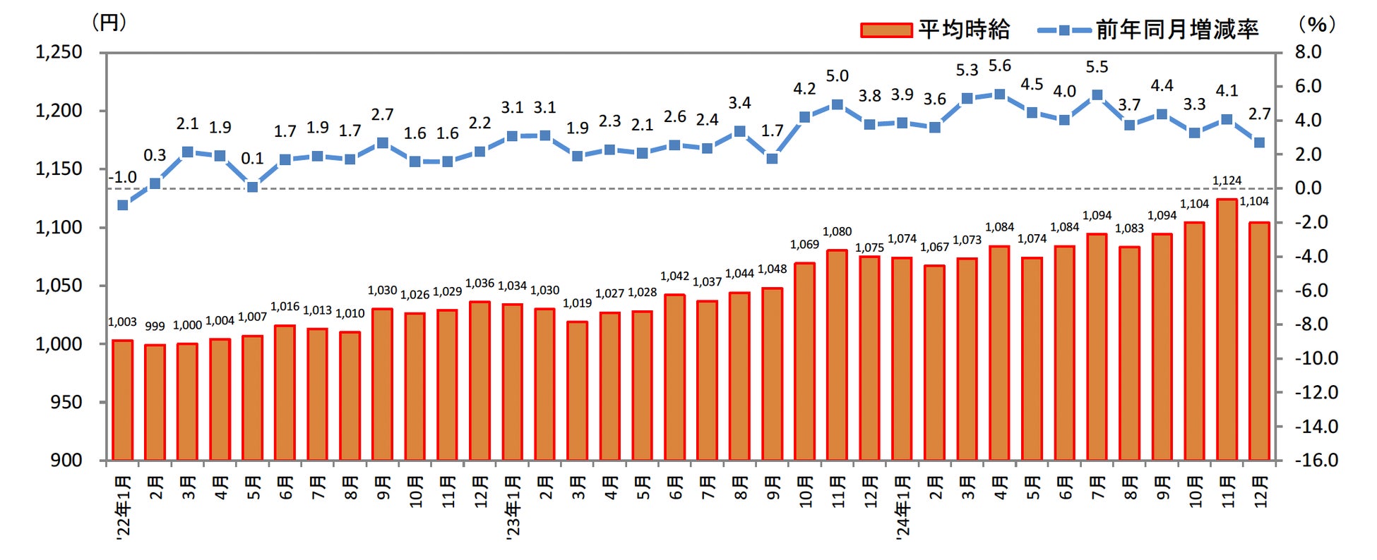 北海道の12月度平均時給は前年同月より29円増加の1,104円