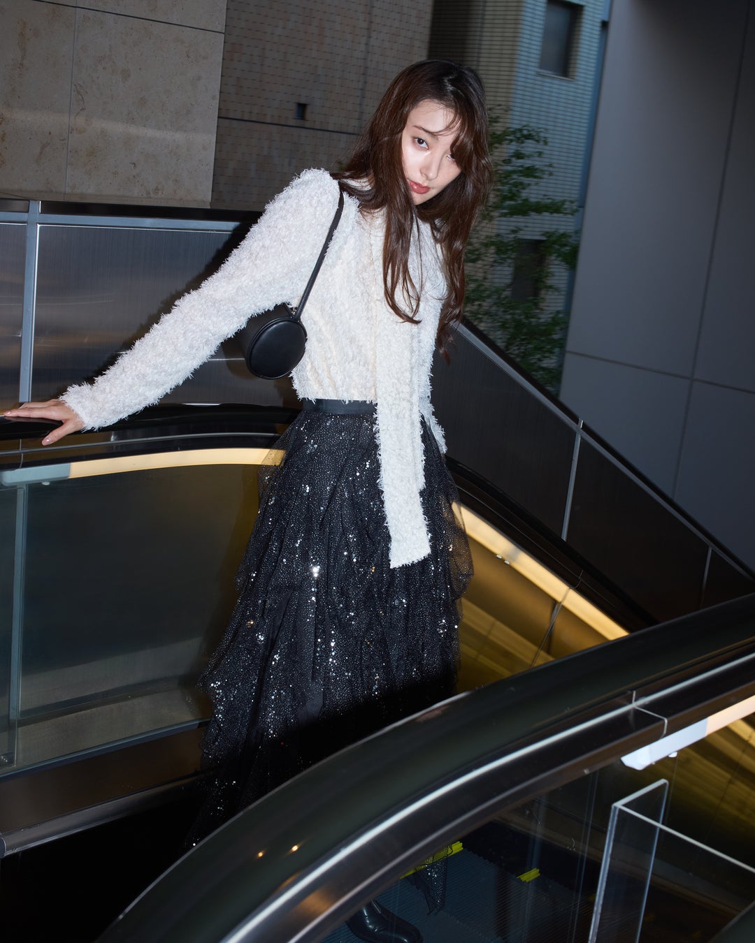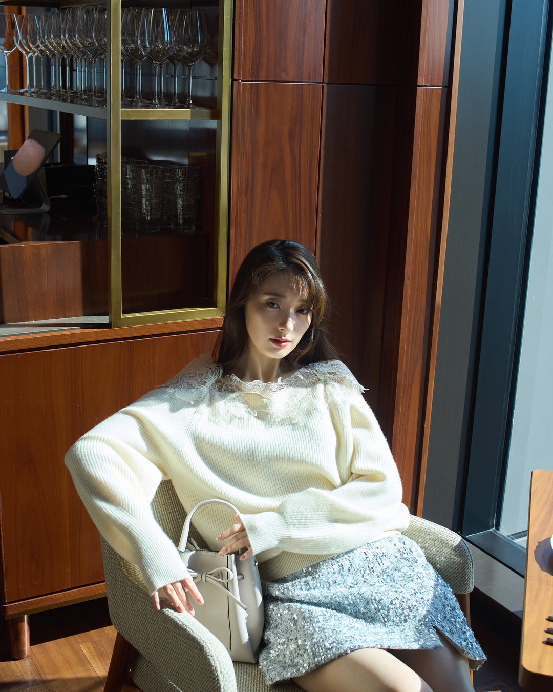 花柄のレースをあしらった特別感あるニットは、大胆なスパンコールのミニと合わせてワンランク上の甘辛コーデで華やかに昇華。ホリデーシーズンに活躍する煌びやかなアイテムを身に纏って。