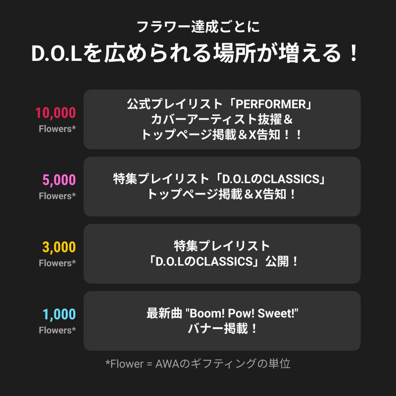 フラワーでD.O.Lを応援しよう!新曲「Boom! Pow! Sweet!」リリースを記念してメンバー登場のAWAラウンジを開催