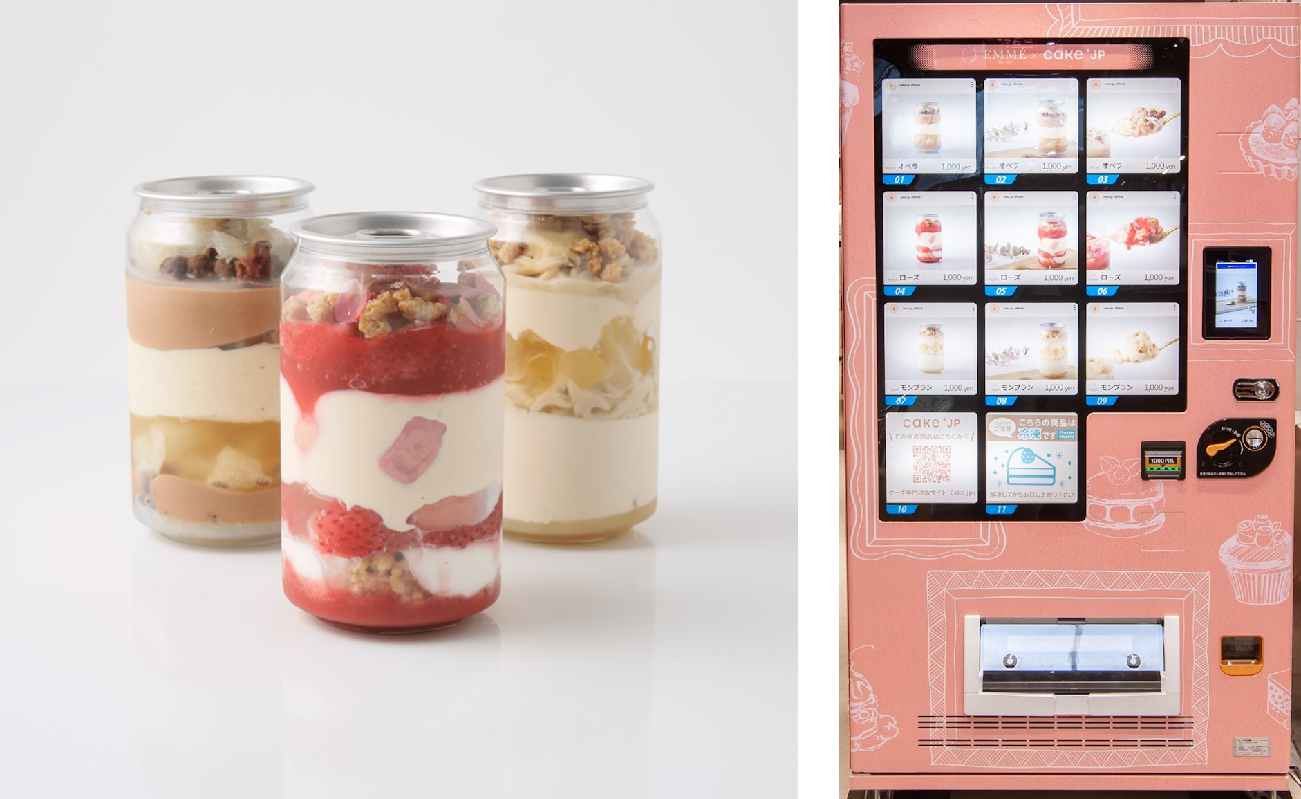 表参道の人気ワインバー「EMME」のデザートを再現したケーキ缶などが購入いただけるCake.jp冷凍自販機。オペラ、モンブラン、薔薇が香るチーズケーキの3種の味をご購入いただけます。それぞれの層が織りなす美しさと、口の中で一体となった瞬間の絶妙なハーモニーをお楽しみください。