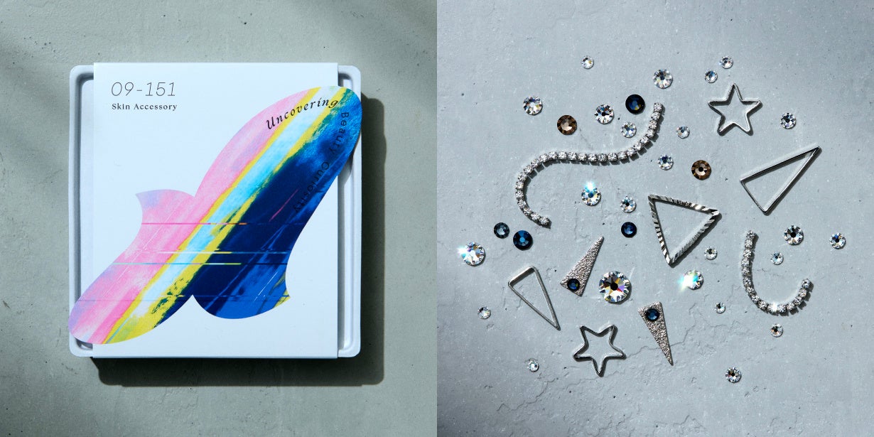 2018年、資生堂は米国ベンチャーOlivo Laboratories社の特許技術「Second Skin」を取得し、資生堂の強みである処方開発技術と組み合わせて、その機能性を進化させてきました※2。「Second Skin」技術は肌と一体化し凹凸を補正する人工皮ふを肌上に形成し、これまでの化粧品の枠を超え、目袋やたるみを短時間で目立たなくすることを可能にしました。「Second Skin」技術の特長である肌と一体化させる人工皮ふの技術を応用することで、アクセサリーパーツは肌に固定され、従来のメイクによる表現を進化させた、デコラティブで多様な表現が可能です。伸縮性・密着性により、剥がれにくさと剥がしやすさを両立するとともに、通気性により肌へのやさしさや心地よさも同時に実現しております。