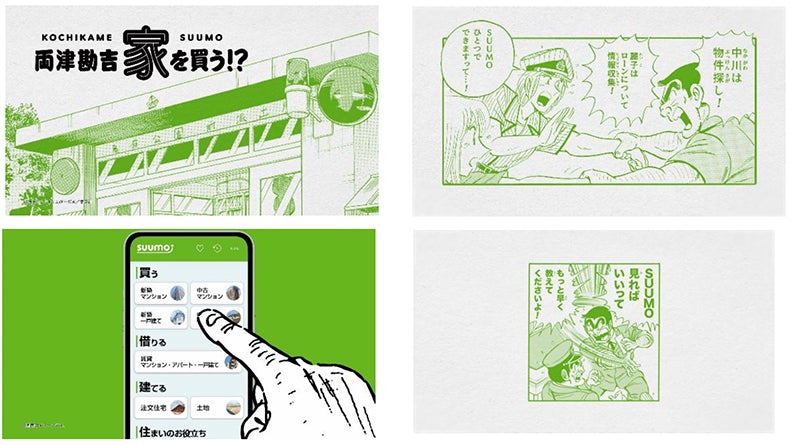 「両津勘吉、家を買う!?〜住まい探しのポータルサイト篇①〜」の1つ目のシーンでは、おなじみの亀有公園前派出所の外観からスタート。原作漫画のシーンを活用し、視聴者に懐かしさを感じさせます。2つ目のシーンでは、両さんが「中川は物件探し!」「麗子はローンについて情報収集!」と二人に指示。しかし中川が「SUUMOひとつでできますって…!」と、『SUUMO』を使えば簡単に解決できることを両さんに教えます。そして3つ目のシーンでは、『SUUMO』の画面を大きく映し出し、条件を入力するだけでサクサクと住まいが探せる様子を紹介。4つ目のシーンでは、両さんが「SUUMO見ればいいって、もっと早く教えてくださいよ!」と大原部長に怒るおなじみのハチャメチャぶりを見せ、笑いを誘います。そしてCMの最後は「家を買うならSUUMOで探しましょう」というナレーションとともに、両さんとスーモがポーズを決めるシーンで締めくくられています。
