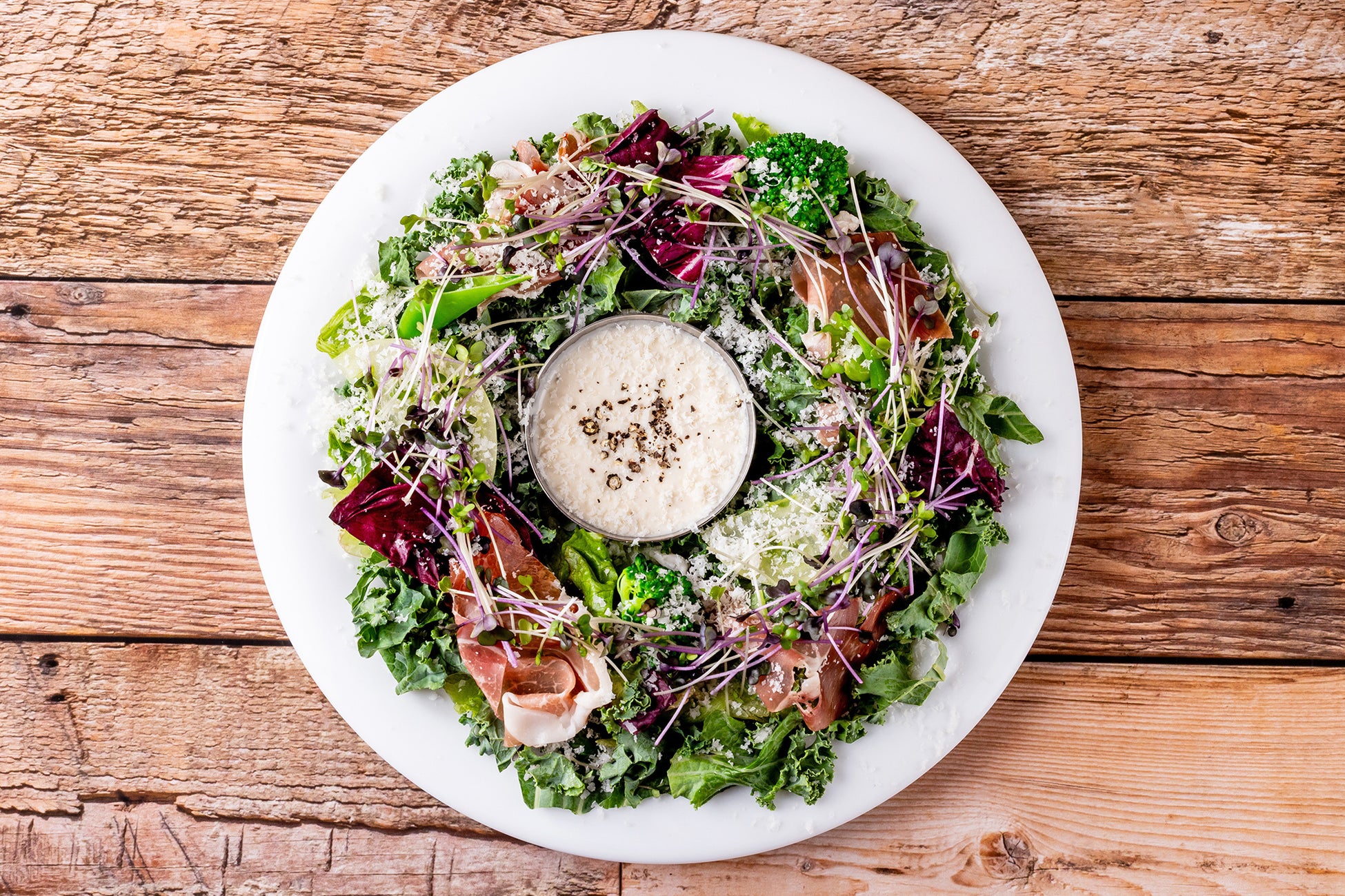 【コース内容】生ハムとケールのリースシーザーサラダ/テイスト・オブ・アロハ/完熟トマトとモッツァレラチーズのピザ/フリフリローストチキン/ブッシュ・ド・ノエル・パンケーキ