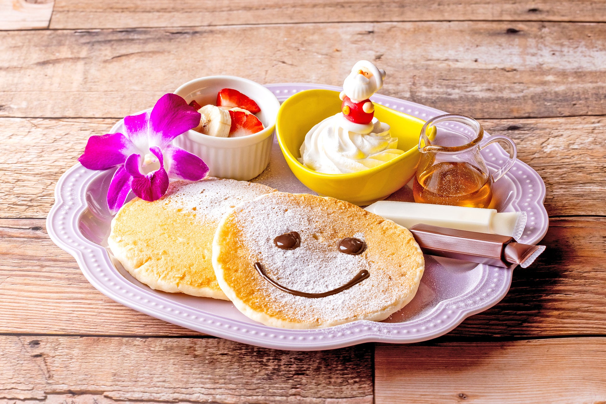 お子さまもパティシエ気分! 国産米粉を使用した、卵不使用のパンケーキ。チョコペンでパンケーキにお絵かきができるので、お子さまが飽きずに楽しめるのもパパ・ママには嬉しいポイント。砂糖菓子のサンタが可愛らしいアクセントになっています。