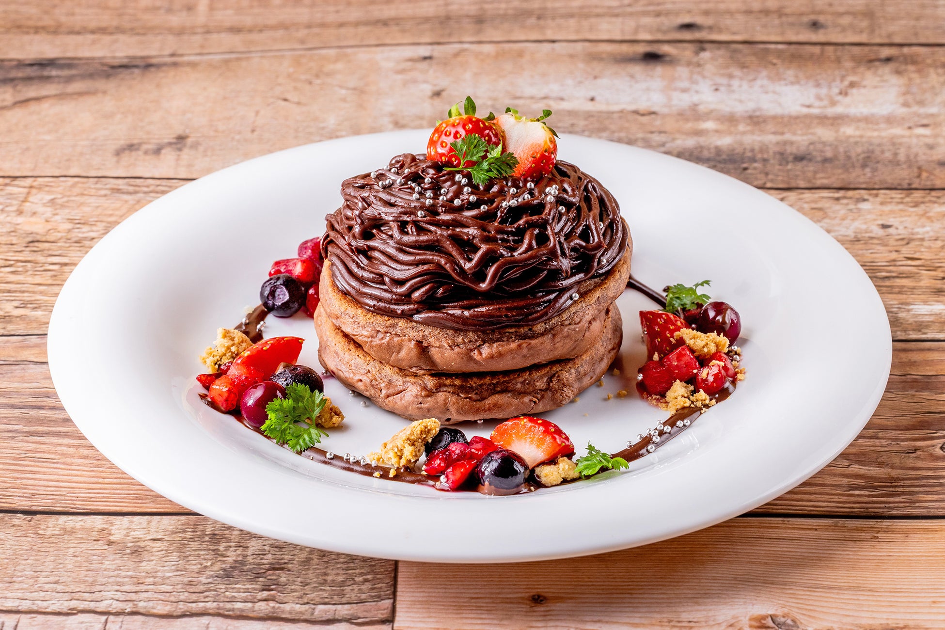 フランス語で「クリスマスの薪」を意味するブッシュ・ド・ノエルを、パンケーキで表現しました。切り株に見立てた生地に、濃厚なヘーゼルナッツチョコレートと甘酸っぱいベリーをトッピング。ちょっぴりビターで大人な味わいのクリスマスパンケーキです。