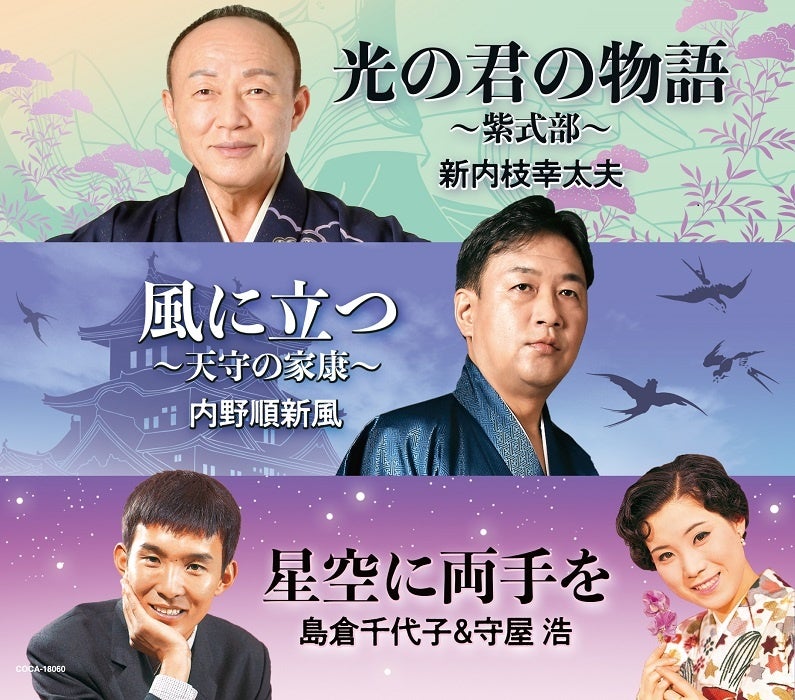 「光の君の物語 〜紫式部〜/風に立つ 〜天守の家康〜/星空に両手を」より「光の君の物語」では紫式部の愛と憂愁の恋を新内枝幸太夫がはんなりと艶めかしく、「風に立つ 〜天守の家康〜」では、徳川家康をモチーフに内野順新風が堂々と。そして島倉千代子、守屋浩の爽やか二人の青春名曲「星空に両手を」を収録。