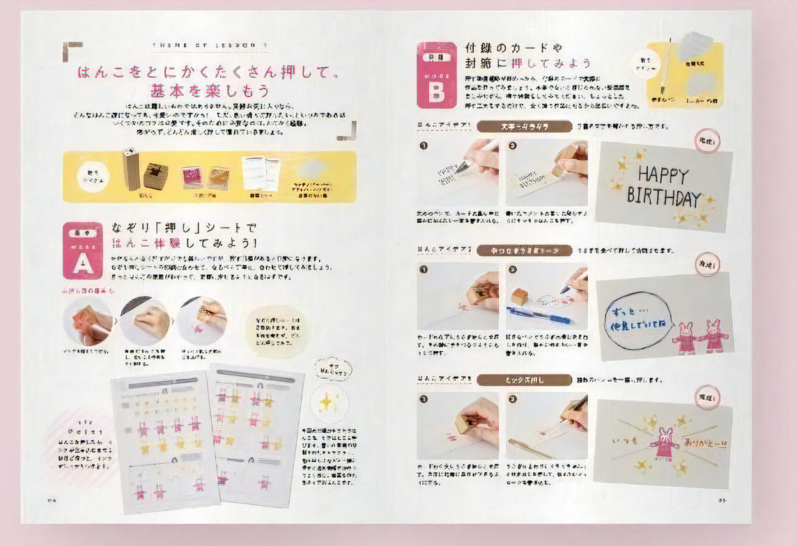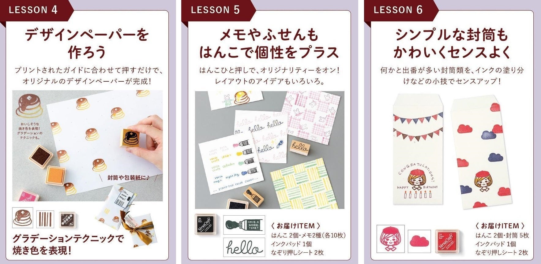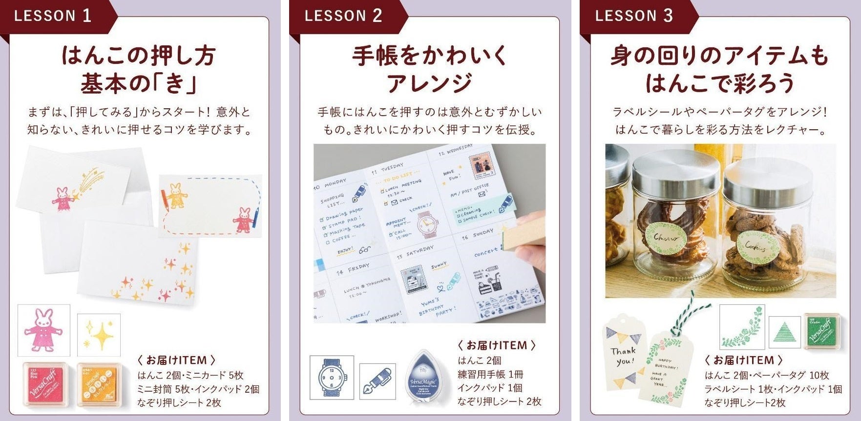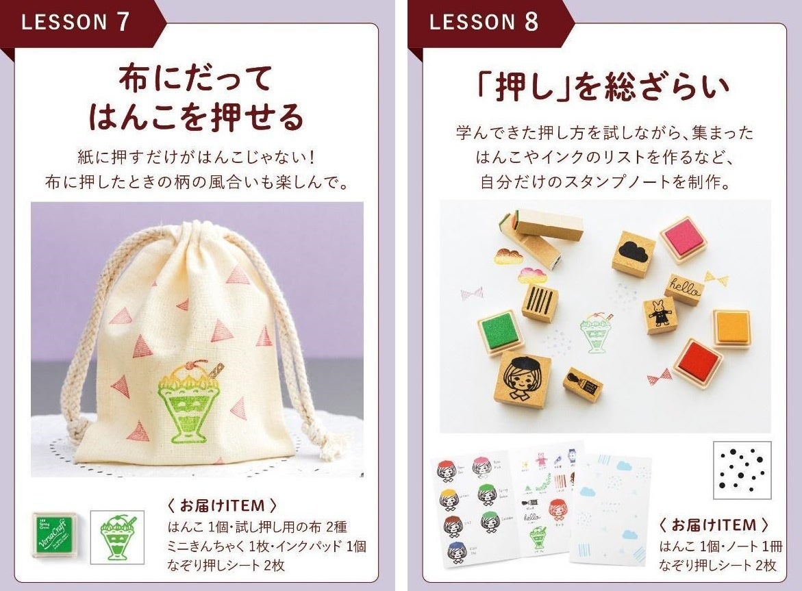 テキストでは、日常生活でのはんこの活用法が紹介されていて、毎月、はんこの新しい魅力や楽しみ方に出会えます。写真と解説でわかりやすくレクチャーしているので、レッスンを進めていくうちに自分のライフスタイルにあわせた楽しみ方もできるようになります。